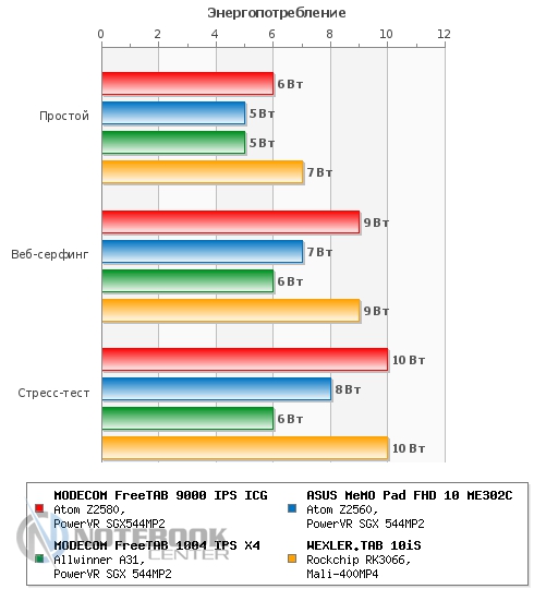 БатареяТаблетка укомплектована батареей емкостью 6500 мАч – это достаточно много, чтобы устройство работало в автономном режиме продолжительное время. В реальной ситуации мы получили следующие результаты: фильмы вы сможете смотреть непрерывно на протяжении почти пяти с половиной часов (для теста мы использовали видеофайл Full HD-формата), а вот в играх гаджет разрядиться гораздо быстрее – за 3 часа 11 минут. Все тестирование выполнялось при включенном Wi-Fi и с максимальным уровнем яркости экрана. Зарядка осуществляется с помощью 10-ватного адаптера, и до 100% планшет можно зарядить за 4 часа 45 минут. Кстати, не очень важная, но крайне неудобная ситуация – родной кабель USB очень короткий, так что держать устройство во время зарядки придется очень близко к розетке. ![]() А вот в вопросе энергопотребления FreeTAB 9000 IPS ICG проявил себя настоящим «обжорой», так как демонстрирует достаточно высокие показатели: в простое, интернет-серфинге и при запуске стресс-теста получилось 6, 9 и 10 Вт соответственно, что немного больше, чем у большинства сравниваемых на графике моделей. ![]() ЗаключениеНовый польский планшет MODECOM FreeTAB 9000 IPS ICG оставил после себя очень приятное впечатление, тем более что относится он к категории не слишком дорогих устройств (ориентировочная цена $250). Таблетка обладает целым рядом преимуществ, что делает ее достаточно конкурентоспособной: сдержанный дизайн имеет свою изюминку; хороший дисплей с матрицей IPS и разрешением 1920х1200 пикселей и аудиосистема в силах сделать досуг очень комфортным; достаточно производительная система позволит решать множество задач разного характера, а емкая батарея обеспечит продолжительный период автономности. При этом не обошлось без досадных недочетов: невпечатляющая работа веб-камеры, эконом-вариант разъемов и портов, достаточно высокий нагрев корпуса в отдельных частях. В сухом остатке имеем планшет, полностью соответствующий своей цене, и его совершенно справедливо можно назвать выгодной покупкой. Благодарим компанию Техника для Бизнеса за любезно предоставленный для тестирования планшет. Также данную модель Вы можете приобрести в сетях магазинов «Комп'ютерний Всесвіт» и «Клік». Дата: 06.05.2014