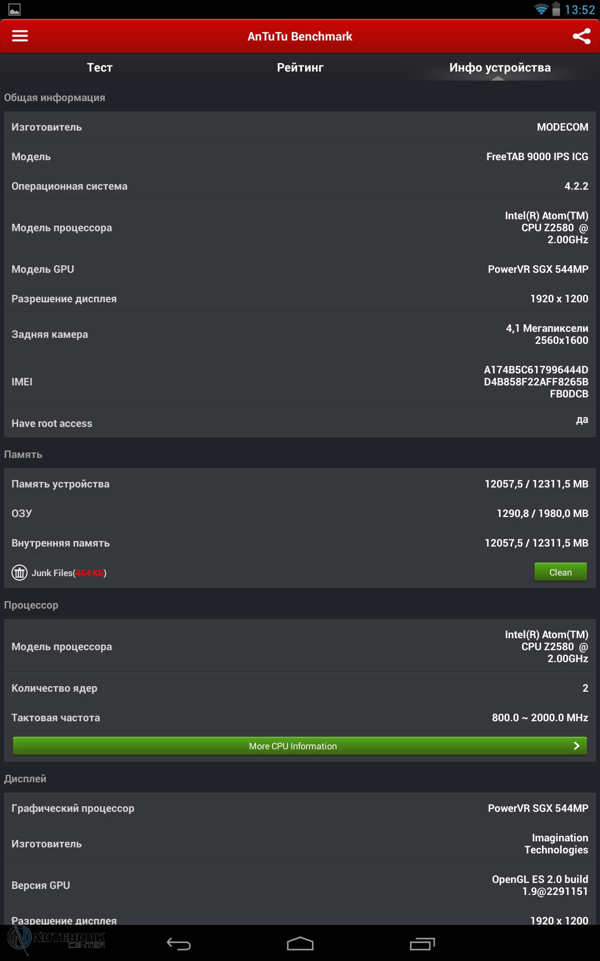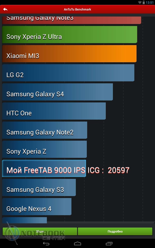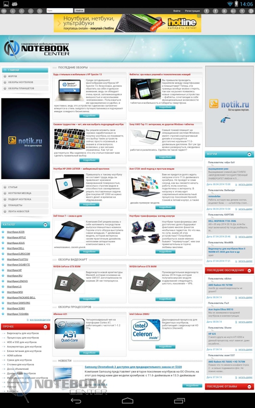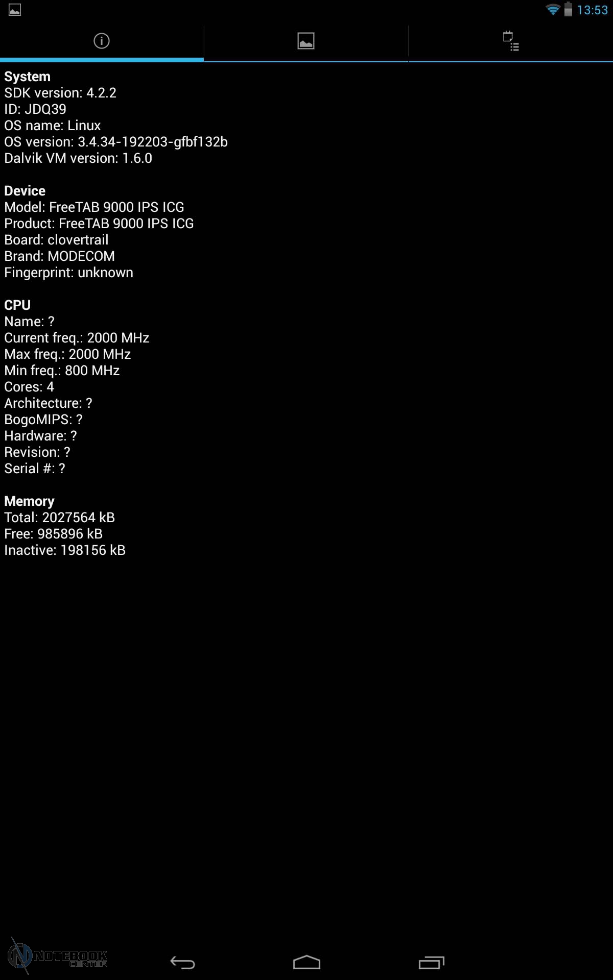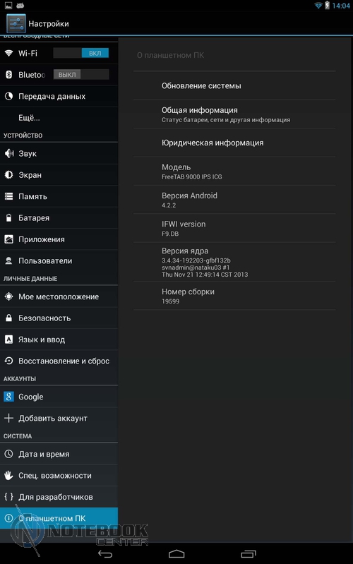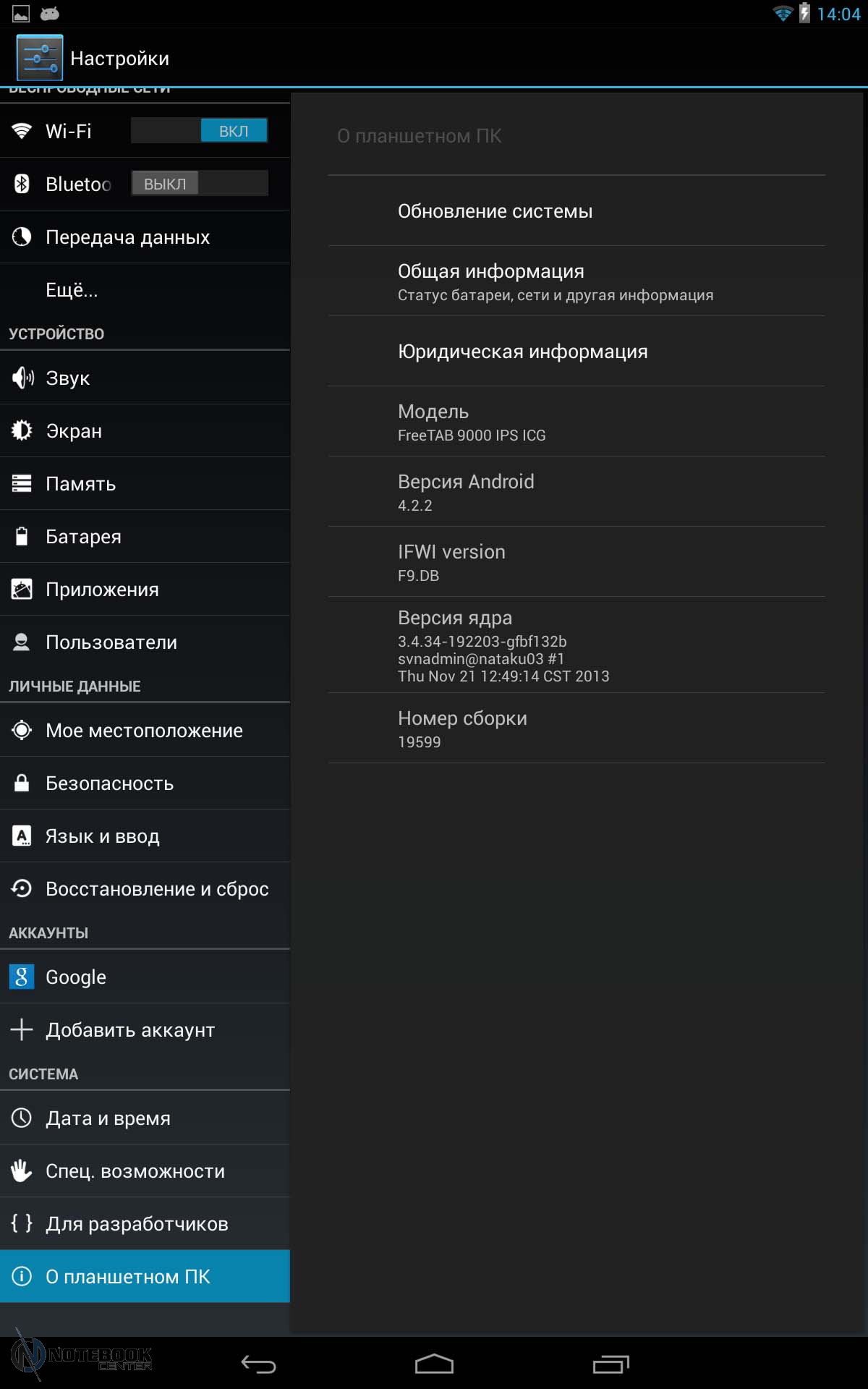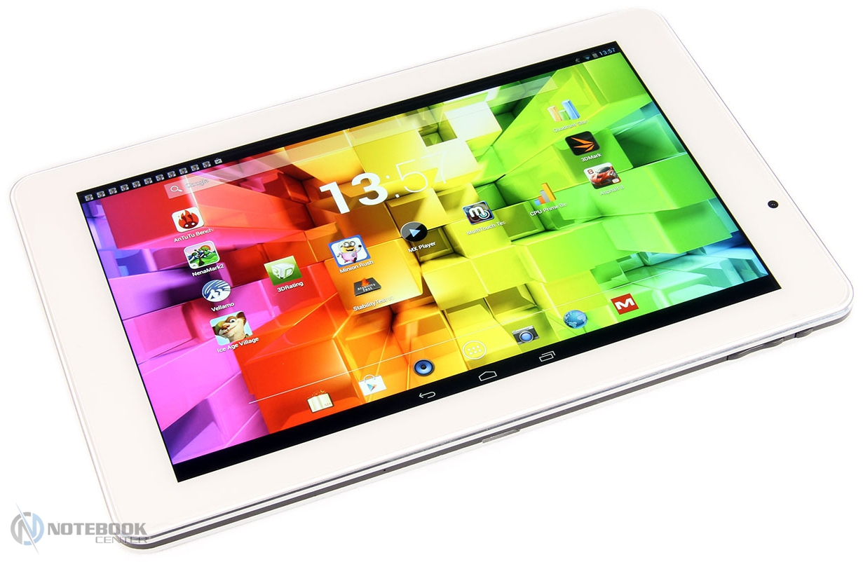 Комплект поставкиКомплект поставки совершенно прост и незамысловат: сам герой обзора, то есть, планшет, пара книжечек с информацией о девайсе, переходник Micro-USB/USB, зарядное устройство с проводом USB и скрепка для изъятия карты microSD. ![]() ДизайнПланшет выполнен в корпусе белого цвета. Передняя и задняя панель покрыты прозрачным пластиком, и создается впечатление, что гаджет стеклянный. Это играет не только эстетическую роль, но и весьма активно скрывает неприглядные отпечатки пальцев. ![]() Боковые грани выполнены из алюминия, они серебристого цвета с декоративной черной полоской по бокам, которая, судя по всему, должна разбавить общий светлый фон планшета. ![]() Спинка устройства также не отличается многообразием элементов декора – сплошная глянцевая панель с глазком веб-камеры в правом верхнем углу, краткой информацией и зеркальным логотипом Intel Inside. ![]() Благодаря форме и малому весу, FreeTAB 9000 IPS ICG очень комфортно держать в руках, более того, он умеренно скользкий, так что пользоваться на весу будет удобно. Кстати, габариты устройства составляют 236х150х9 мм, вес всего лишь 468 г. ![]() Дисплей, звук и веб-камераНа вооружении у FreeTAB 9000 IPS ICG стоит 8.9-дюймовый дисплей с разрешающей способностью 1920х1200 пикселей. Устройство обладает очень неплохим экраном, при чем это касается всех интересующих параметров – цветопередачи, углов обзора, чувствительности, отзывчивости и др. Углы обзора широкие, что горизонтальные, что вертикальные, благодаря использованию матрицы IPS. Нельзя сказать, что цвета идеально яркие и сочные, однако смотреть, например, фильмы, на таком экране приятно, да и контрастность находится на должном уровне. ![]() Яркость необходимо регулировать самостоятельно, автонастройки здесь нет. Максимального уровня более чем достаточно, и даже на солнце пользоваться планшетом очень удобно. ![]() ![]() С помощью программы MultiTouch Tester было установлено, что планшет распознает управление сразу пятью пальцами. Высокая чувствительность дисплея так же, как и отзывчивость, делают пользование еще больше комфортным и результативным. ![]() Читалка из FreeTAB 9000 IPS ICG получается просто отличная, по умолчанию предусмотрена программа Moon + Reader. ![]() Серфить интернет придется, скорее всего, при постоянном масштабировании страниц, так как достаточно высокое разрешение экрана делает шрифт мелковатым. ![]() Что касается акустики, то планшет, безусловно, радует. Два динамика расположены на боковых гранях корпуса, если использовать планшет в альбомной ориентации. Вот только если держать планшет в руках, то стоит обратить внимание, что его надо перевернуть так, чтобы не перекрывать решетки, иначе звук может заметно приглушаться. Впрочем, звучит акустика очень громко, и сам звук оптимально сбалансирован по диапазону частот, и, между прочим, басов здесь в самый раз, что характерно далеко не всем современным таблеткам. ![]() В планшет установлено две веб-камеры: фронтальная имеет разрешение 2 Мп и используется для общения в Skype. ![]() ![]() А вот тыловая получила 5 Мп и автофокус. ![]() ![]() КлавиатураСенсорная клавиатура здесь стандартная, со средними по размеру клавишами и типичными для Android 4.2 функциями. Текст набирается быстро и комфортно, никаких претензий в этом отношении к планшету нет. ![]() ПроизводительностьMODECOM FreeTAB 9000 IPS ICG работает под управлением операционной системы Android 4.2.2 Jelly Bean. Здес