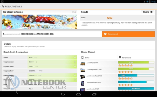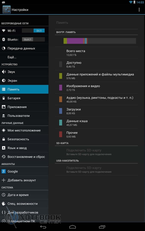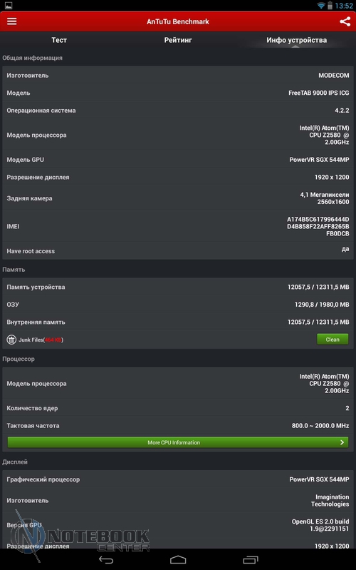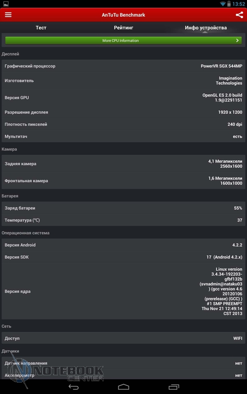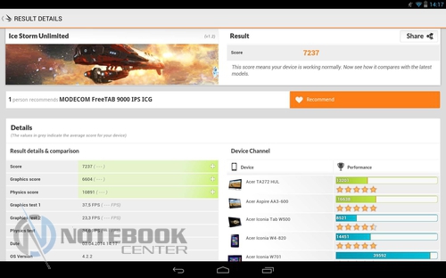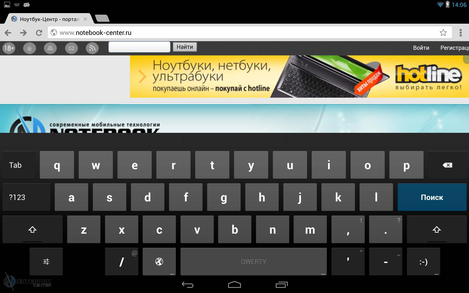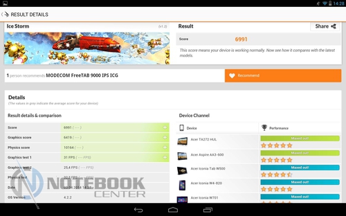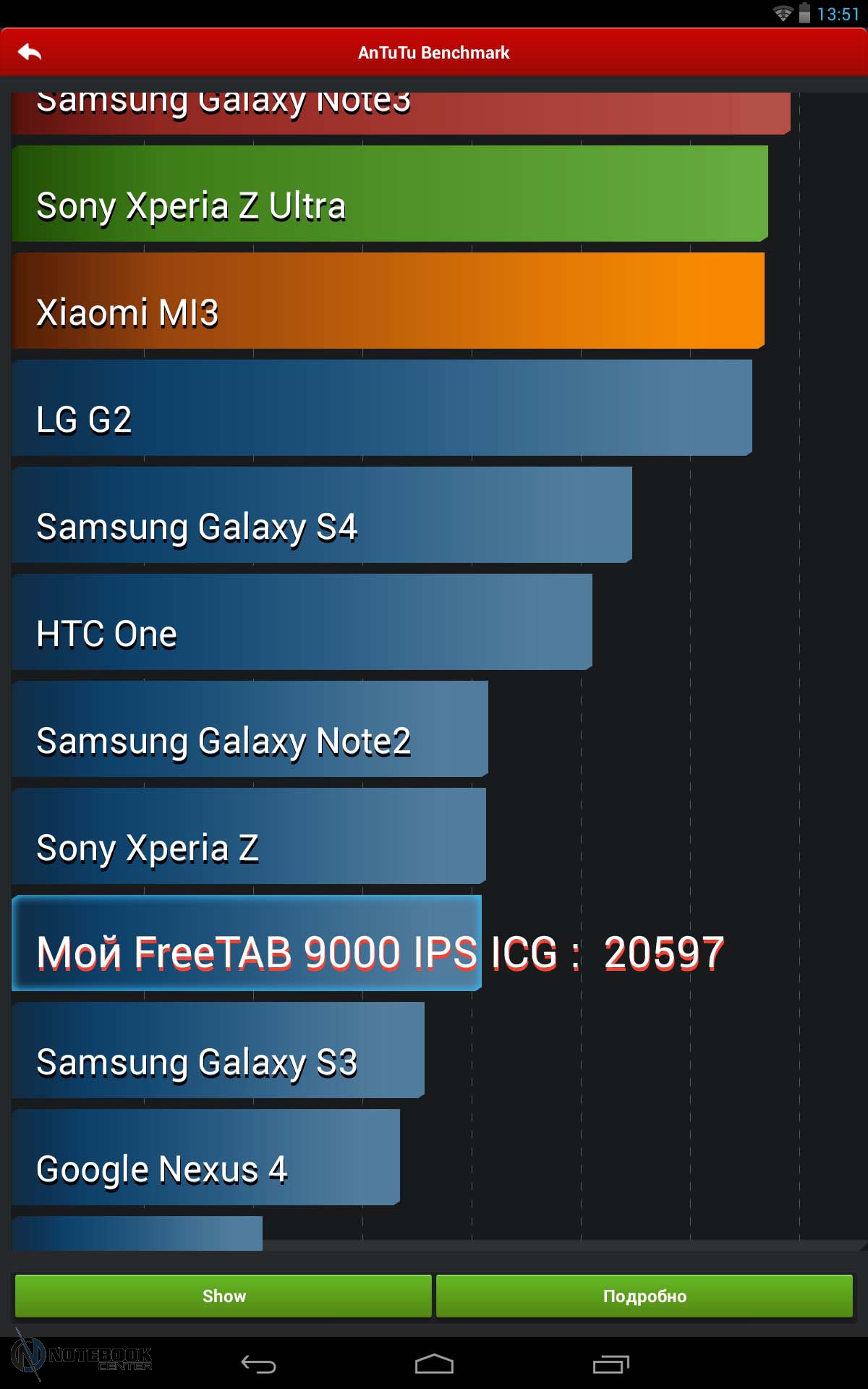 Комплект поставкиКомплект поставки совершенно прост и незамысловат: сам герой обзора, то есть, планшет, пара книжечек с информацией о девайсе, переходник Micro-USB/USB, зарядное устройство с проводом USB и скрепка для изъятия карты microSD. ![]() ДизайнПланшет выполнен в корпусе белого цвета. Передняя и задняя панель покрыты прозрачным пластиком, и создается впечатление, что гаджет стеклянный. Это играет не только эстетическую роль, но и весьма активно скрывает неприглядные отпечатки пальцев. ![]() Боковые грани выполнены из алюминия, они серебристого цвета с декоративной черной полоской по бокам, которая, судя по всему, должна разбавить общий светлый фон планшета. ![]() Спинка устройства также не отличается многообразием элементов декора – сплошная глянцевая панель с глазком веб-камеры в правом верхнем углу, краткой информацией и зеркальным логотипом Intel Inside. ![]() Благодаря форме и малому весу, FreeTAB 9000 IPS ICG очень комфортно держать в руках, более того, он умеренно скользкий, так что пользоваться на весу будет удобно. Кстати, габариты устройства составляют 236х150х9 мм, вес всего лишь 468 г. ![]() Дисплей, звук и веб-камераНа вооружении у FreeTAB 9000 IPS ICG стоит 8.9-дюймовый дисплей с разрешающей способностью 1920х1200 пикселей. Устройство обладает очень неплохим экраном, при чем это касается всех интересующих параметров – цветопередачи, углов обзора, чувствительности, отзывчивости и др. Углы обзора широкие, что горизонтальные, что вертикальные, благодаря использованию матрицы IPS. Нельзя сказать, что цвета идеально яркие и сочные, однако смотреть, например, фильмы, на таком экране приятно, да и контрастность находится на должном уровне. ![]() Яркость необходимо регулировать самостоятельно, автонастройки здесь нет. Максимального уровня более чем достаточно, и даже на солнце пользоваться планшетом очень удобно. ![]() ![]() С помощью программы MultiTouch Tester было установлено, что планшет распознает управление сразу пятью пальцами. Высокая чувствительность дисплея так же, как и отзывчивость, делают пользование еще больше комфортным и результативным. ![]() Читалка из FreeTAB 9000 IPS ICG получается просто отличная, по умолчанию предусмотрена программа Moon + Reader. ![]() Серфить интернет придется, скорее всего, при постоянном масштабировании страниц, так как достаточно высокое разрешение экрана делает шрифт мелковатым. ![]() Что касается акустики, то планшет, безусловно, радует. Два динамика расположены на боковых гранях корпуса, если использовать планшет в альбомной ориентации. Вот только если держать планшет в руках, то стоит обратить внимание, что его надо перевернуть так, чтобы не перекрывать решетки, иначе звук может заметно приглушаться. Впрочем, звучит акустика очень громко, и сам звук оптимально сбалансирован по диапазону частот, и, между прочим, басов здесь в самый раз, что характерно далеко не всем современным таблеткам. ![]() В планшет установлено две веб-камеры: фронтальная имеет разрешение 2 Мп и используется для общения в Skype. ![]() ![]() А вот тыловая получила 5 Мп и автофокус. ![]() ![]() КлавиатураСенсорная клавиатура здесь стандартная, со средними по размеру клавишами и типичными для Android 4.2 функциями. Текст набирается быстро и комфортно, никаких претензий в этом отношении к планшету нет. ![]() ПроизводительностьMODECOM FreeTAB 9000 IPS ICG работает под управлением операционной системы Android 4.2.2 Jelly Bean. Здес