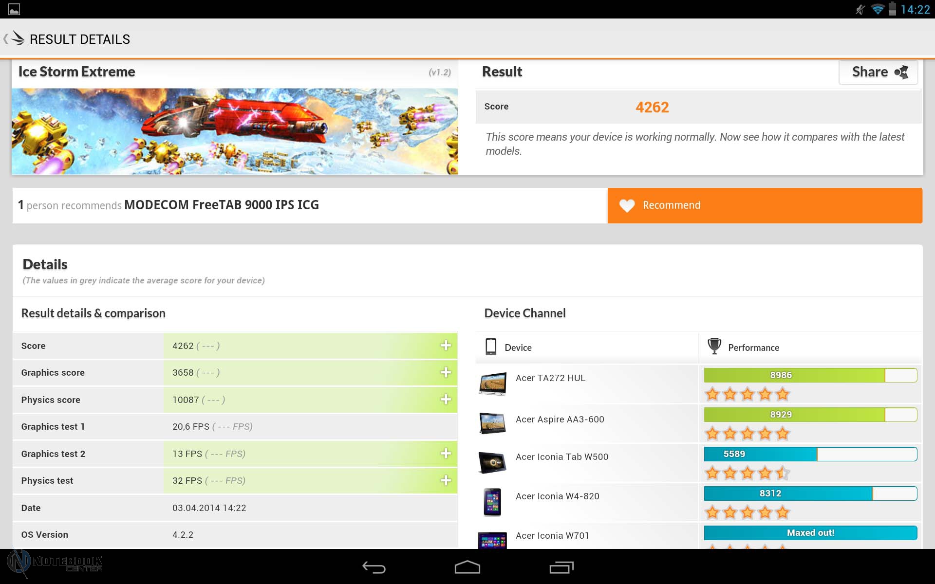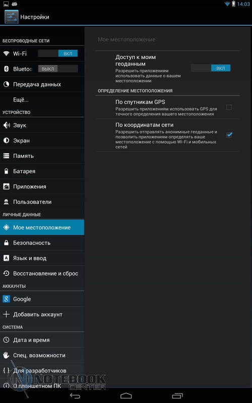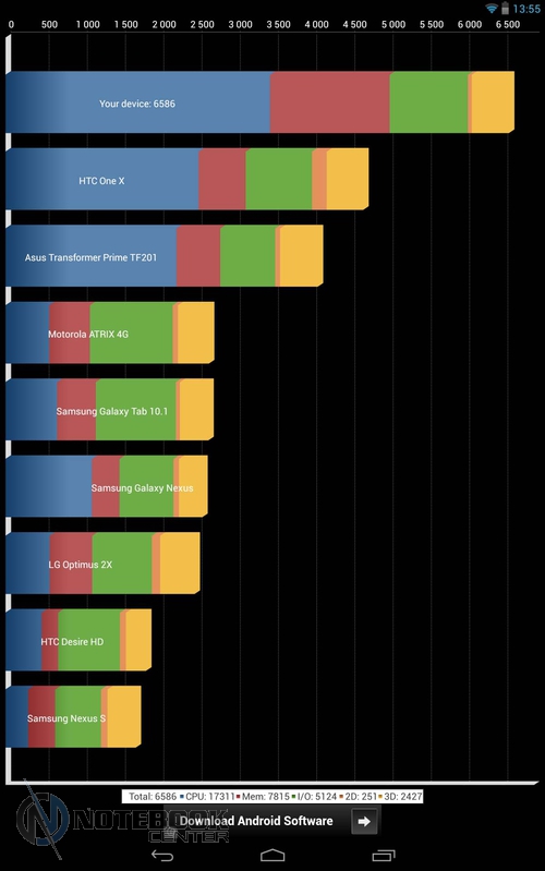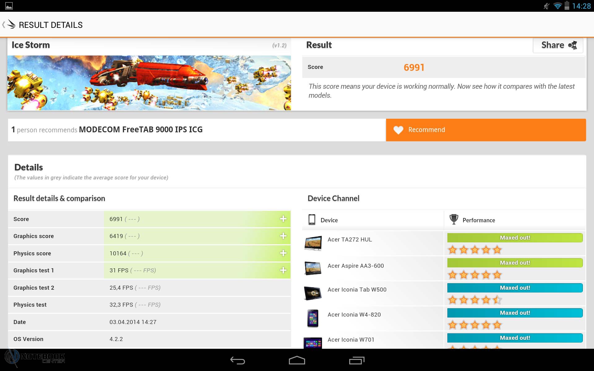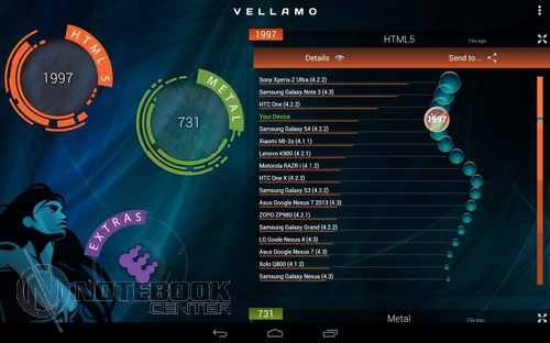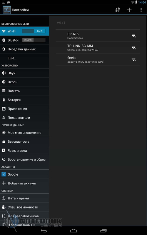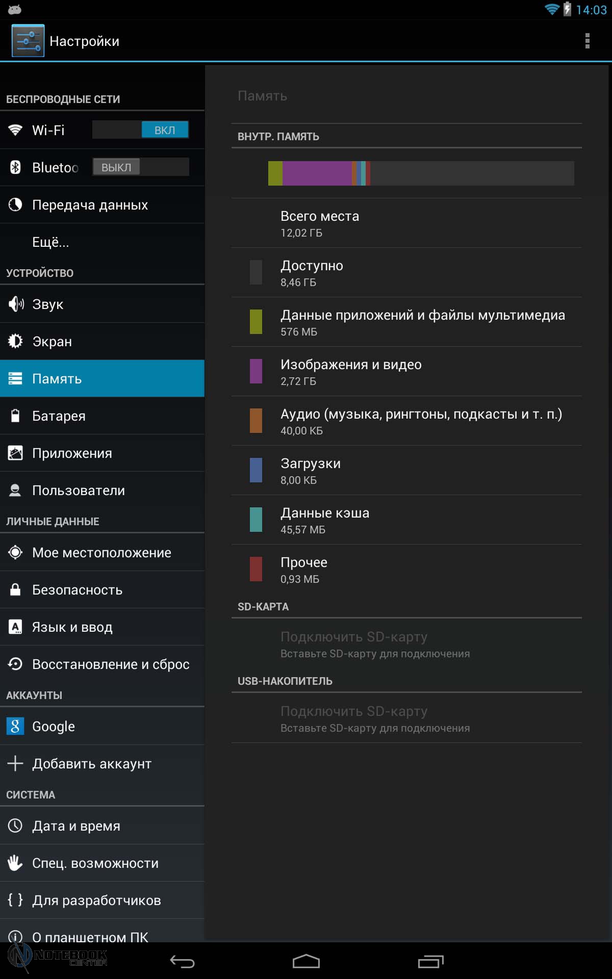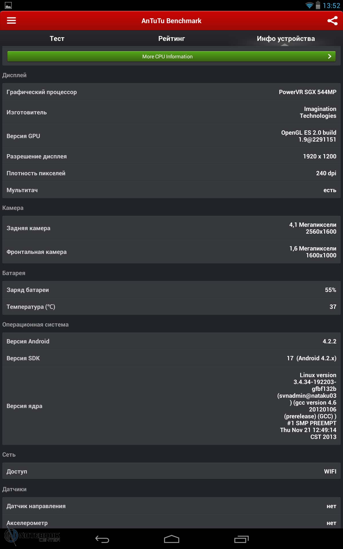 Комплект поставкиКомплект поставки совершенно прост и незамысловат: сам герой обзора, то есть, планшет, пара книжечек с информацией о девайсе, переходник Micro-USB/USB, зарядное устройство с проводом USB и скрепка для изъятия карты microSD. ![]() ДизайнПланшет выполнен в корпусе белого цвета. Передняя и задняя панель покрыты прозрачным пластиком, и создается впечатление, что гаджет стеклянный. Это играет не только эстетическую роль, но и весьма активно скрывает неприглядные отпечатки пальцев. ![]() Боковые грани выполнены из алюминия, они серебристого цвета с декоративной черной полоской по бокам, которая, судя по всему, должна разбавить общий светлый фон планшета. ![]() Спинка устройства также не отличается многообразием элементов декора – сплошная глянцевая панель с глазком веб-камеры в правом верхнем углу, краткой информацией и зеркальным логотипом Intel Inside. ![]() Благодаря форме и малому весу, FreeTAB 9000 IPS ICG очень комфортно держать в руках, более того, он умеренно скользкий, так что пользоваться на весу будет удобно. Кстати, габариты устройства составляют 236х150х9 мм, вес всего лишь 468 г. ![]() Дисплей, звук и веб-камераНа вооружении у FreeTAB 9000 IPS ICG стоит 8.9-дюймовый дисплей с разрешающей способностью 1920х1200 пикселей. Устройство обладает очень неплохим экраном, при чем это касается всех интересующих параметров – цветопередачи, углов обзора, чувствительности, отзывчивости и др. Углы обзора широкие, что горизонтальные, что вертикальные, благодаря использованию матрицы IPS. Нельзя сказать, что цвета идеально яркие и сочные, однако смотреть, например, фильмы, на таком экране приятно, да и контрастность находится на должном уровне. ![]() Яркость необходимо регулировать самостоятельно, автонастройки здесь нет. Максимального уровня более чем достаточно, и даже на солнце пользоваться планшетом очень удобно. ![]() ![]() С помощью программы MultiTouch Tester было установлено, что планшет распознает управление сразу пятью пальцами. Высокая чувствительность дисплея так же, как и отзывчивость, делают пользование еще больше комфортным и результативным. ![]() Читалка из FreeTAB 9000 IPS ICG получается просто отличная, по умолчанию предусмотрена программа Moon + Reader. ![]() Серфить интернет придется, скорее всего, при постоянном масштабировании страниц, так как достаточно высокое разрешение экрана делает шрифт мелковатым. ![]() Что касается акустики, то планшет, безусловно, радует. Два динамика расположены на боковых гранях корпуса, если использовать планшет в альбомной ориентации. Вот только если держать планшет в руках, то стоит обратить внимание, что его надо перевернуть так, чтобы не перекрывать решетки, иначе звук может заметно приглушаться. Впрочем, звучит акустика очень громко, и сам звук оптимально сбалансирован по диапазону частот, и, между прочим, басов здесь в самый раз, что характерно далеко не всем современным таблеткам. ![]() В планшет установлено две веб-камеры: фронтальная имеет разрешение 2 Мп и используется для общения в Skype. ![]() ![]() А вот тыловая получила 5 Мп и автофокус. ![]() ![]() КлавиатураСенсорная клавиатура здесь стандартная, со средними по размеру клавишами и типичными для Android 4.2 функциями. Текст набирается быстро и комфортно, никаких претензий в этом отношении к планшету нет. ![]() ПроизводительностьMODECOM FreeTAB 9000 IPS ICG работает под управлением операционной системы Android 4.2.2 Jelly Bean. Здес