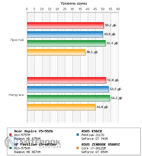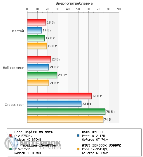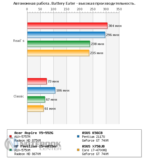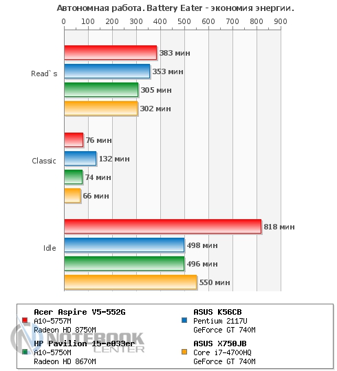 Честно говоря, ноутбук Aspire V5-552G является относительно шумным, ведь даже в простое шумомер зафиксировал 50.2 дБ. Однако под нагрузкой замеры показали всего на 1.6 дБ больше, хотя то, что он работал, было слышно во всем офисе. Если сравнивать по уровню шума Aspire V5 с конкурентами, то он показывает практически равные результаты в простое и под нагрузкой с HP Pavilion 15-e033er и ASUS K56CB. Самым тихим в этой компании оказался ASUS U500VZ с 45 дБ. ![]() БатареяВ ноутбуке установлена 4-секционная литий-полимерная батарея, имеющая емкость 3560 мАч. Для ее зарядки, длящейся 3 часа 06 минут, используется 90-ваттный блок питания. ![]() Традиционно для проверки автономности мы запустили тест Battery Eater, выставив сначала план электропитания «Экономия энергии». В режиме «Read’s» ноутбук смог отработать 6 часов 23 минуты, тогда как в «Classic» только 1 час 16 минут. Такая продолжительность работы позволит отправляться в командировку, не переживая, что в самый неподходящий момент Aspire V5-552G разрядится. В действительности больше всего порадовало время в простое, которое составило 13 часов 38 минут. Именно этот результат впечатляюще выглядит на фоне трех других соперников: ASUS K56CB, ASUS X750JB и HP Pavilion 15, которые в простое разряжаются ранее 10 часов. Кстати, Aspire V5-552G не уступил конкурентам ни минуты и в режиме чтения. ![]() Если говорить об автономности в «Высокой производительности», то здесь в «Read’s» ноутбук смог отработать 5 часов 04 минуты, тогда как в «Classic» заряда батареи хватило всего на 1 час 13 минут. На графике видно, что он, как и прежде, лидирует в «Read’s» и занимает второе место в «Classic». ![]() Что касается энергопотребления, то, учитывая начинку, его можно назвать небольшим. В простое мы получили 18 Вт, при просмотре веб-страниц – 23 Вт и во время стресс-теста – 63 Вт. На графике видно, что на фоне соперников по уровню потребляемой энергии Acer Aspire V5-552G выглядит весьма неплохо. ![]() ЗаключениеЭтот ноутбук оптимально подойдет для тех, кто хочет получить от ноутбука максимальный профит, тратя на это не более $650. За эти деньги вы получите неплохое время работы от АКБ, довольно производительную начинку, много места на винчестере для хранения различных файлов. Матовый экран мог бы быть и лучше в отношении яркости, контрастности и цветопередачи, впрочем, для ежедневных задач его будет достаточно. Что касается устройств ввода, то здесь все создано для максимального удобства: островная клавиатура с нампадом, крупный тачпад с хорошей чувствительностью. Наконец, стильный дизайн ноутбука и качественная сборка, а также весьма достойная продолжительность работы и не слишком высокое энергопотребление. Acer Aspire V5-552G понравится тем, кому нужен функциональный, презентабельный и сбалансированный во всех отношениях ноутбук. Благодарим компанию AMD в Украине за любезно предоставленный для тестирования ноутбук. Дата: 30.05.2014