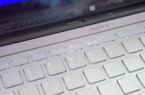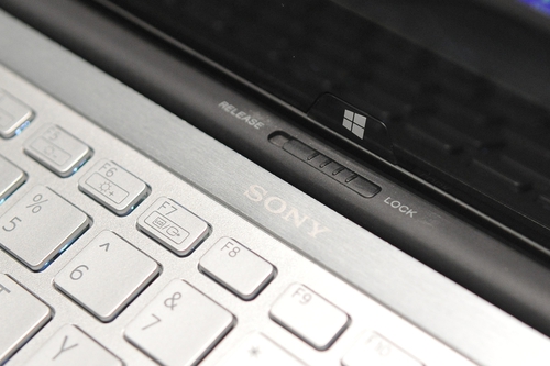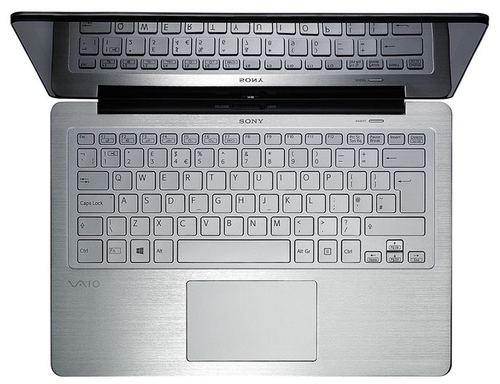 Вполне удобного размера оказался стрелочный блок, ведь часто в компактных ноутбуках он очень маленький, и, как следствие – неудобный. Кнопка [Enter] является однорядной, по размеру левый [Shift] лишь немного уступает правому. Пробел в VAIO SV-F13N1J2R удлиненный, что, несомненно, добавляет комфорта в эксплуатации. Алюминиевая подладонная поверхность большая, что позволяет рукам отдыхать в случае необходимости. В верхней части клавиатуры можно увидеть небольшой рычажок, на который нужно нажимать, чтобы превратить ноутбук в планшет.