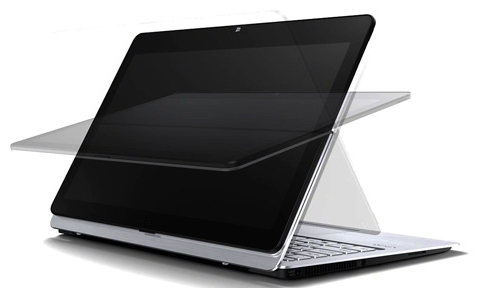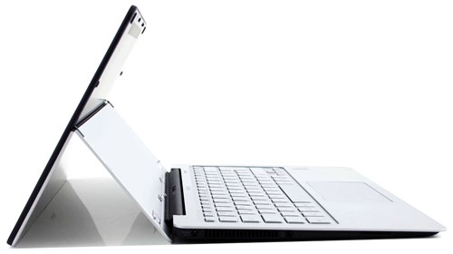 В качестве материала производитель выбрал шлифованный алюминий для верхней крышки дисплея и подладонной поверхности, серебристый пластик для клавиатуры и обычный черный для боковых торцов и днища. Использование в конструкции пластика, скорее всего, обусловлено тем, чтобы устройство было не слишком тяжелым, в частности, в режиме планшета. А так удалось создать трансформер весом 1.31 кг.