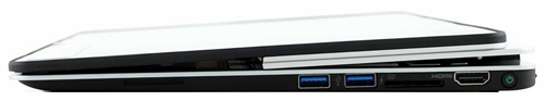 Количество интерфейсов в трансформере несколько удручает, ведь их очень мало, к тому же, практически все они расположены на правом торце гаджета. Судите сами: здесь вы найдете два порта USB 3.0 (один из которых способен выполнять функцию подзарядки), видеовыход HDMI, кардридер поддерживающий microSD, SDHC и SDXC, а также круглая кнопка включения трансформера.