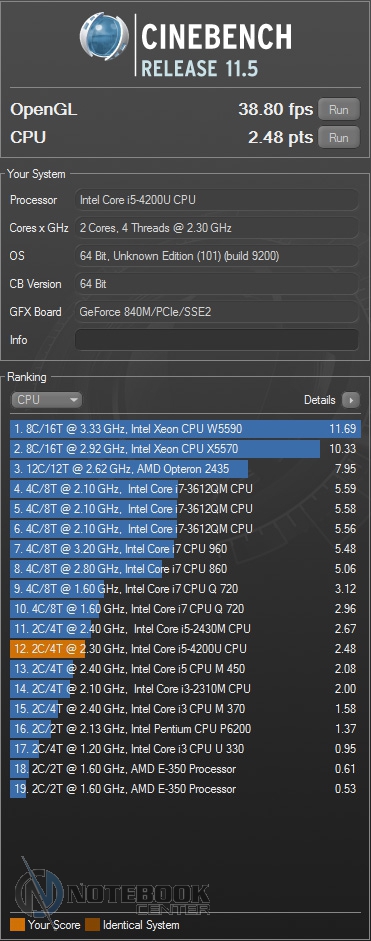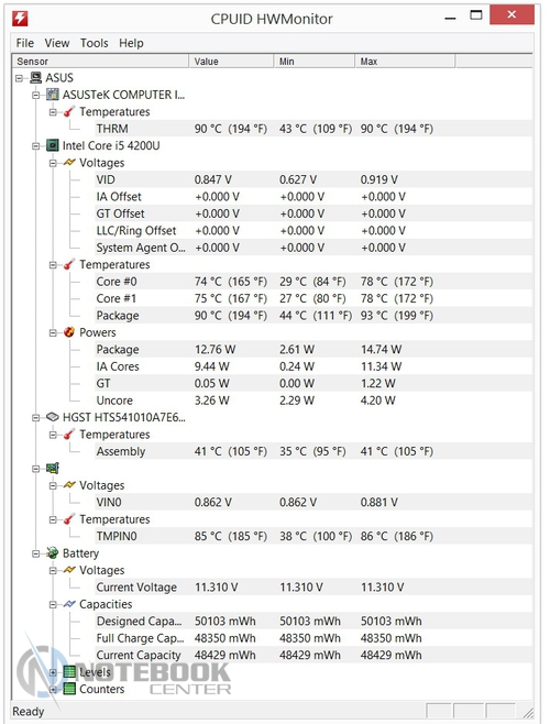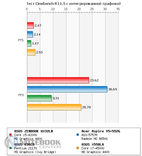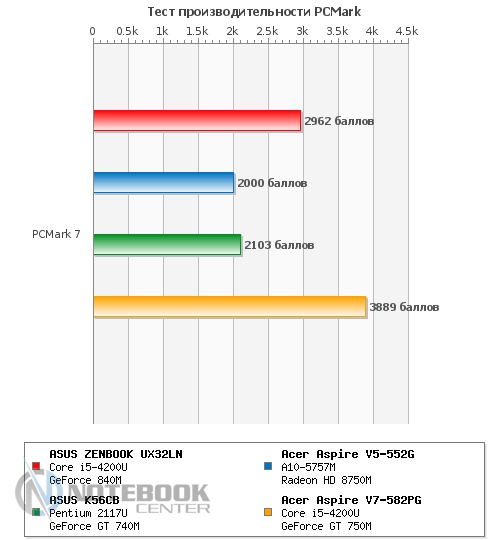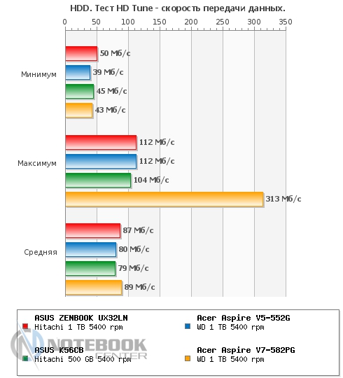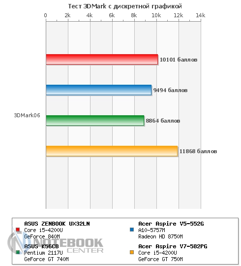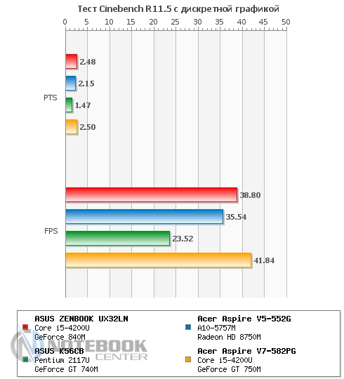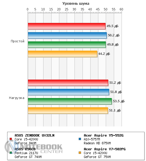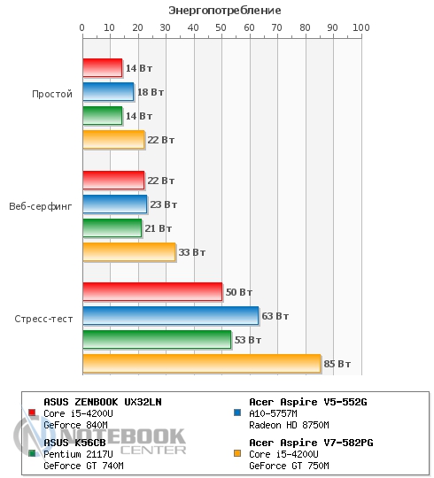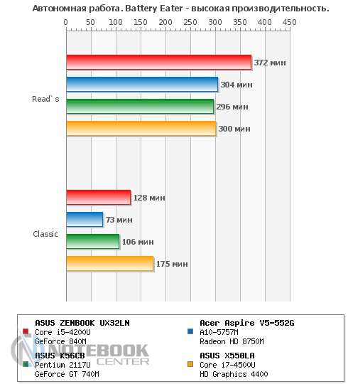 Уровень шума, издаваемый ноутбуком в процессе работы оказался средним, примерно таким же как и у большинства своих конкурентов: в простое – 49.5 дБ, под нагрузкой – 51.2 дБ. ![]() БатареяASUS ZENBOOK UX32L оборудован несъемной 6-секционной литий-полимерной батареей емкостью 50 Втч. Для того чтобы полностью ее зарядить понадобится совсем немного времени – 2 часа 33 минуты. Зарядка осуществляется с помощью 65-ваттного блока питания. ![]() Чтобы узнать возможности автономности ноутбука, мы использовали приложение Battery Eater. С планом питания «Высокая производительность» в режиме «Read» Зенбук продержался 6 часов 11 минут, в режиме «Classic» этот показатель уменьшился практически втрое, и составил 2 часа 9 минут. Это очень и очень неплохие результаты, что подтверждает сравнительный график: UX32LN в чтении забирает первую позицию, причем отрыв от ближайшего преследователя превышает один час, в «Classic», правда, он уступает X550LA. ![]() Вторая часть тестирования с планом энергопотребления «Экономия энергии» подтверждает, что UX32LN обладает хорошим потенциалом в вопросе автономной работы. Итак, снизив яркость до 40% и не используя «железо» на полную мощность, в режиме «Read» ZENBOOK проработал 9 часов 34 минуты, в «Classic» – 2 часа 29 минут. ![]() Кстати, в вопросе энергопотребления UX32LN также представляет собой экономичное решение. В простое ему требуется 14 Вт, при веб-серфинге – 22 Вт, при максимальной нагрузке (стресс-тест AIDA и Furmark) – 50 Вт. Между прочим, по этому показателю Зенбук имеет одни из самых скромных результатов. ![]() ЗаключениеНесомненно, ASUS ZENBOOK UX32LN – это интересная новинка на рынке ультрабуков, которая сможет привлечь достаточное внимание к своей «персоне». Ноутбук обладает рядом преимуществ, главное из них – наличие дискретной графики в столь малогабаритном и тонком корпусе. NVIDIA GeForce 840M обладает достаточно хорошей производительностью, что позволит заняться обработкой графики/видеомонтажем и поиграть в свободное время. Таким образом, сочетание в ZENBOOK UX32LN хорошего процессора и дискретной видеокарты дают отличную производительность. А качественный Full HD-дисплей с матовым покрытием и матрицей IPS, и достаточно емкая батарея дополняют образ нового Зенбука. Стоит все это не дешево, но, по крайней мере, цена примерно в $1200 вполне обоснована. Единственное, хотелось бы, конечно, побольше памяти, но, наверное, человек, который купит такое устройство, сможет позволить себе докупить и планку памяти на больший объем, нежели 2 ГБ предустановленных. Благодарим представительство ASUS в Украине www.asus.ua за любезно предоставленный для тестирования ноутбук. Дата: 21.05.2014