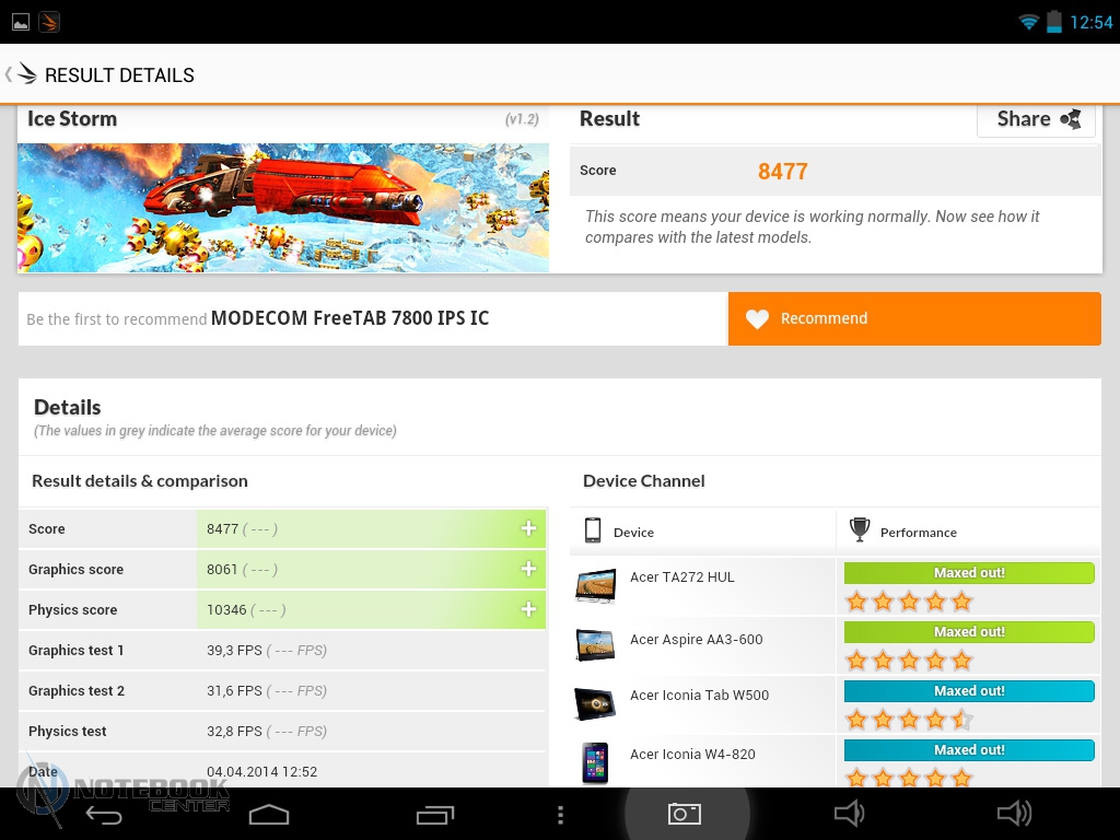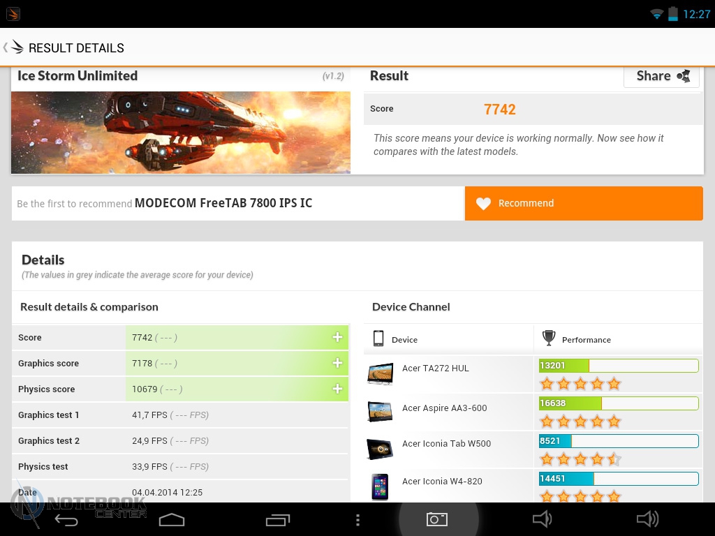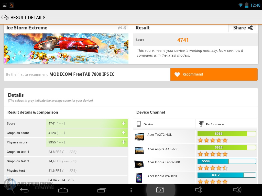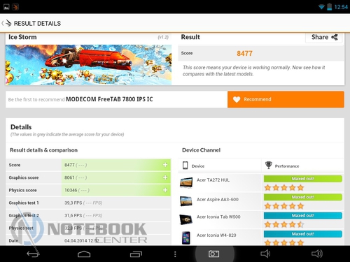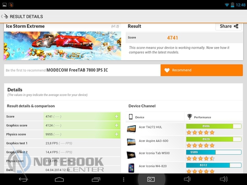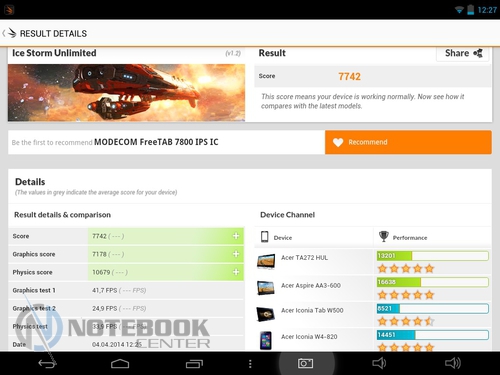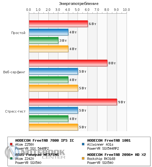 Как видим, температурные показатели едва ли можно назвать некомфортными, даже под нагрузкой, не говоря уже о том, что во время выполнения нетребовательных задач, например, веб-серфинга, данный планшет остается приятно прохладным. БатареяВ MODECOM FreeTAB 7800 IPS IC установлен аккумулятор емкостью 4600 мАч. С такой батареей «посадить» планшет играми нам удалось за 2 часа 40 минут. Показатели автономности во время воспроизведения фильма составили 5 часов 7 минут. Время зарядки «с нуля» составило 3 часа 10 минут. Исходя из этих данных, можно с уверенностью констатировать, что данный планшет станет идеальным спутником для непродолжительных поездок, и несколько часов в дороге пролетят незаметно. ![]() Отметим также и энергопотребление: в простое оно составляет 6 Вт, в режиме веб-серфинга – 8 Вт, а в режиме стресс-теста – 9 Вт. ![]() ЗаключениеПротестировав планшет MODECOM FreeTAB 7800 IPS IC, мы можем сделать некоторые выводы. Его дизайн напомнил нам Apple iPad, особенно использование серебристого алюминия на крышке. Формат и форм-фактор планшета также совпадают – 4:3 и 7.85" соответственно. При этом FreeTAB 7800 не является бледной копией своего более именитого конкурента. В большинстве тестов он показал отличные результаты, легко справился с требовательными современными играми, с воспроизведением фильмов высокого качества, а также, разумеется, с веб-серфингом. В этом ему помогает не только сильная начинка, но и качественный дисплей. Небольшим недостатком можно считать малое количество интерфейсов, но вот цена приятно радует – в среднем, $220. ![]() Благодарим компанию Техника для Бизнеса за любезно предоставленный для тестирования планшет. Также данную модель Вы можете приобрести в сетях магазинов «Комп'ютерний Всесвіт» и «Клік». Дата: 28.04.2014