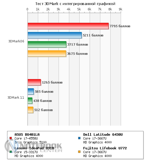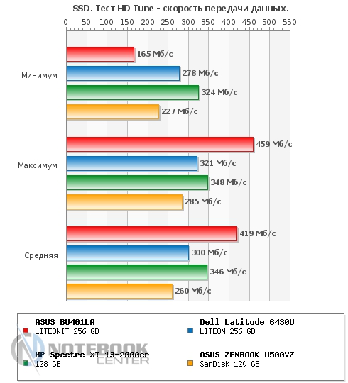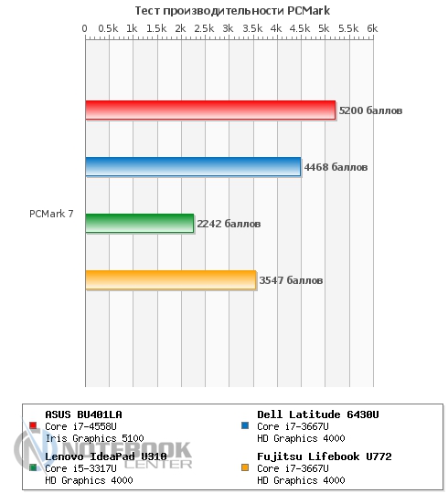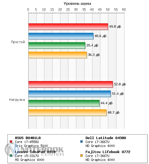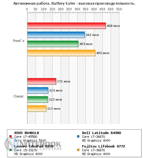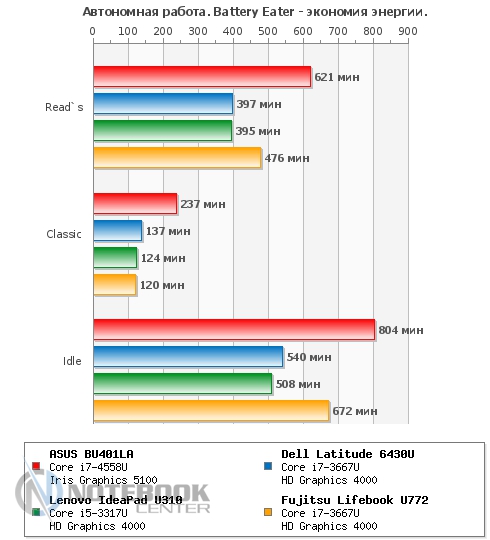 К сожалению, сказать, что ASUS BU401LA является тихим устройством – мы не можем. При работе слышен шелест вентиляторов системы охлаждения, которые, к слову сказать, хорошо выполняют свою работу. Во время тестов по замеру шума были получены следующие результаты: режим простоя – 49.8 дБ, режим полной нагрузки – 52.8 дБ. К слову сказать, среди представленных на графике моделей, ASUS BU401LA является самым шумным, что вызывает удивление, разрыв между не самым тихим Dell Latitude 6430U и нашим героем составляет целых 10 дБ, что совсем немало. ![]() БатареяУльтрабук ASUS BU401LA оснащен 4-секционной литий-полимерной батареей емкостью 6840 мАч. Так как корпус цельный, то добраться до батареи не так легко, поэтому быстро заменить ее не удастся. Зарядка ультрабука осуществляется 65-ваттным блоком питания компактного размера, что будет плюсом в поездке, так как носить с собой компактный блок питания легче, чем увесистый. Время зарядки составляет 2 часа 43 минуты – не очень быстро, но стоит учесть довольно большую емкость батареи. ![]() Тестирование батареи производилось с помощью утилиты Battery Eater. При установленном плане электропитания «Экономия энергии» ASUS BU401LA показал следующие результаты: режим «Classic» – 3 часа 57 минут, режим «Read's» – 10 часов 21 минута, и простой – 13 часов 24 минуты. Благодаря емкой батарее ASUS BU401LA уверенно держит лидирующие позиции в тесте батареи плана электропитания «Экономия энергии». Причем разница в режиме «Read's» между нашей моделью и ноутбуками от Lenovo и Dell составила более 200 минут! А результату в режиме простоя позавидуют даже планшеты. ![]() Время автономной работы от батареи в плане энергопотребления «Высокая производительность» в режиме «Classic» составило 2 часа 51 минуту, а в режиме «Read's» – 7 часов 48 минут. График сравнения времени автономной работы в плане электропитания «Высокая производительность» нас несколько поразил, так как по ходу тестирования наша модель уверено опережала всех конкурентов по производительности, значит, была высокая вероятность, что она покажет не очень хорошие результаты автономности под нагрузкой. Но ситуация оказалась совершенно другой – ASUS BU401LA уверенно превзошел конкурентов как в режиме чтения, так и в режиме нагрузки, причем в последнем он обогнал всех конкурентов почти на треть. ![]() В ходе тестирования также был произведен замер энергопотребления в трех режимах работы. В состоянии простоя оно составило 10 Вт, при интернет-серфинге – 17 Вт, а при полной загрузке (AIDA+Furmakr) данный показатель достиг 44 Вт. Анализируя полученные данные, можно сказать, что его энергопотребление в режиме простоя и в режиме веб-серфинга является очень скоромным, как для такой начинки .К примеру, в простое ASUS BU401LA потребляет меньше, чем все конкуренты, а при веб-серфинге он уступает по экономичности лишь Fujitsu. Но в состоянии нагрузки свой «характер» показывает производительная начинка, что заставляет ASUS BU401LA «пожирать» больше энергии. ![]() ЗаключениеЭтот ультрабук – устройство не для каждого, хотя я думаю мало, кто отказался бы от такого девайса. Но все же это довольно специализированный и «заточенный» под стандарты бизнеса и корпоративные задачи ультрабук. В доказательство этому можно привести повышенные требования к безопасности, в виде сканера отпечатка пальца, встроенного модуля TPM, соответствия военному стандарту MIL-STD-810G и другие «фишки». Также не