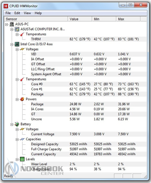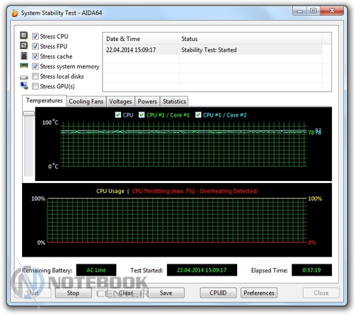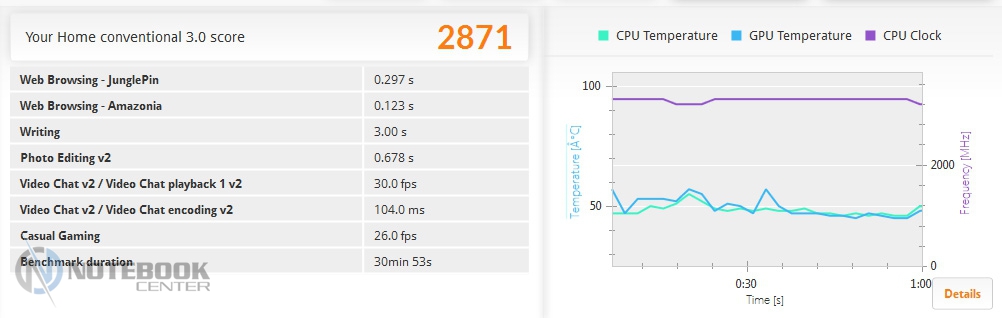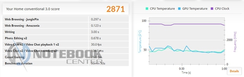 Тонкий и компактный корпус всегда был проблемой для отвода тепла из устройства, а с появлением новых более мощных компонентов эта проблема становится еще острее. Для того чтобы имитировать полную нагрузку, мы запустили стресс-тест AIDA и Furmark. В итоге общий уровень температуры поднялся на несколько градусов по сравнению с простоем, но все-таки в большинстве остался на приемлемом уровне. Только в центральной и верхней части ноутбука показатели превысили 32 градуса, а максимальный нагрев был зафиксирован на отметке 39.3 градуса Цельсия.