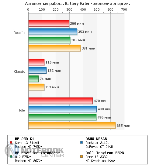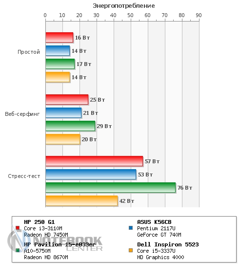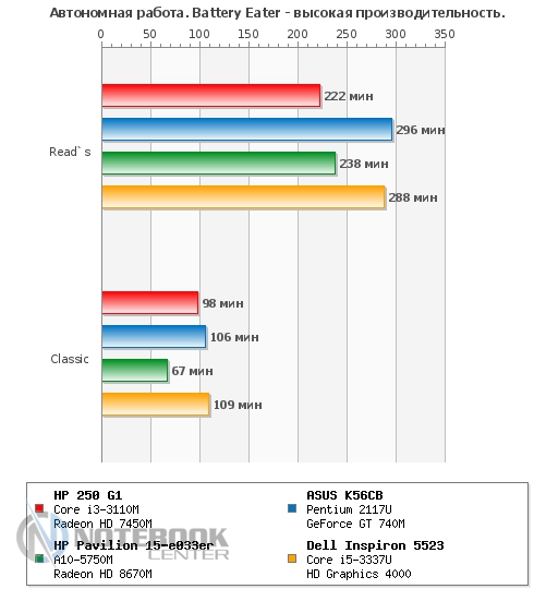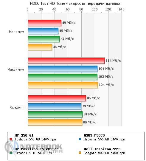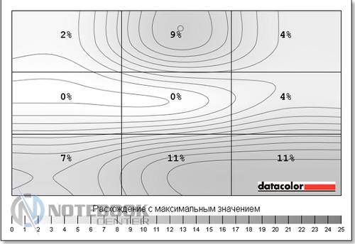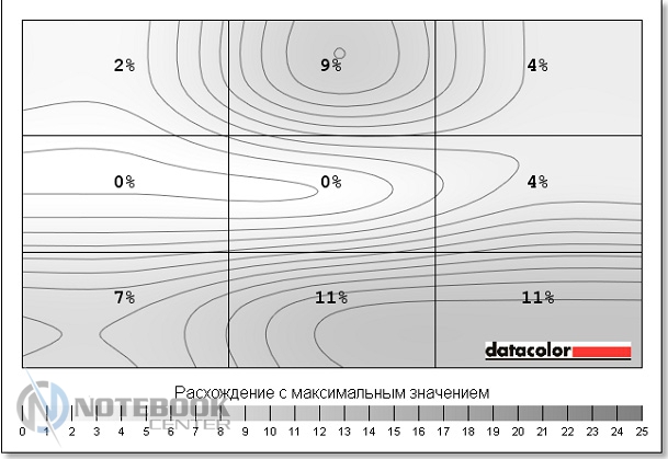 Комплект поставкиУчитывая, что у нас на тестировании оказался бюджетный лэптоп, мы не ожидали от него какого-то изобилия в комплекте поставки. Так что, помимо самого ноутбука, мы имеем блок питания, кабель для зарядки, а также необходимую документацию. ![]() ДизайнВнешний вид HP 250 G1 достаточно скромен: в нем нет никаких изысков, а вместо алюминия приходится довольствоваться пластиком. Впрочем, выглядит он достаточно гармонично и стильно. Крышка, так же, как и подладонная поверхность, серого цвета, а клавиатура и рамка дисплея – черные. Весь пластик, использованный в дизайне гаджета, матовый, плюс ко всему, он практичный и практически не оставляет на себе отпечатки пальцев. Дизайн крышки лаконичен, в центре можно увидеть лишь небольшой фирменный логотип HP. ![]() Открываем ноутбук, и первое, что бросается в глаза – 15.6-дюймовый экран, над которым виднеется веб-камера. Дисплей скреплен с основанием двумя крепкими петлями. Кстати, это единственная глянцевая деталь в данном устройстве. ![]() Что касается днища, то оно также выполнено из пластика, достаточно приятного на ощупь, хоть и не софт-тач. Там же имеются четыре круглые прорезиненные ножки, цель которых – предотвратить скольжение гаджета на любой поверхности. Также имеется доступ до внутренних компонентов лэптопа: потянув за бегунок, можно снять батарею, а дальше, открутив пару винтиков, можно добраться к слоту RAM. Ну, а избавившись от нескольких винтиков на крышке рядом со слотом RAM, и, сняв еще одну пластинку, вы увидите винчестер. ![]() Первое впечатление от ноутбука следующее: HP 250 G1 кажется прочным и крепким устройством, несмотря на то, что в качестве материалов производитель использовал только пластик. Качество сборки хорошее, петли тугие, но в меру, крышка не шатается и не прогибается. Кстати, это устройство достаточно мобильное, ведь его габариты составляют 377x247x35 мм, а вес – 2.4 кг. ![]() ДисплейСтоимость лэптопа HP 250 G1 относительно низкая, поэтому невольно начинаешь задумываться, на чем же инженеры Hewlett Packard сэкономили. Чаще всего, вниманием обделяют дисплей, и наш ноутбук не стал исключением. Экран гаджета матовый, его разрешение составляет 1366х768 пикселей, а матрица выполнена по технологии TN+Film. Различие между ней и IPS бросается в глаза сразу, на дисплее картинка не самая яркая, да и углы обзора не дотягивают до идеальных параметров. Яркость регулируется при помощи функциональных клавиш [F2] и [F3]. Максимальный уровень яркости достаточно приемлемый для восприятия, хотя мог бы быть повыше. Впрочем, для домашнего использования этого должно быть достаточно. ![]() Для определения уровня яркости, цветопередачи и других составляющих дисплея, мы использовали калибратор Datacolor Spyder4Elite. Максимальная яркость нашего экрана составила 209 кд/м2, максимальное значение черного – 2.38 кд/м2, а контрастность при 100% - 90:1. Исходя из этих данных, можно отметить, что показатель яркости относительно неплохой, а вот черный цвет на данном экране он выглядит тусклее, чем должен быть. Такая же ситуация и с контрастностью: такой уровень достаточно низкий. ![]() Следующий момент – равномерность подсветки. На картинке ниже мы видим, что она достаточно неравномерна, в некоторых местах уровень яркости заметно ниже. ![]() ![]() Цветовой охват также важен для определения характеристик дисплея в целом. Как известно, чем он выше, тем более ре