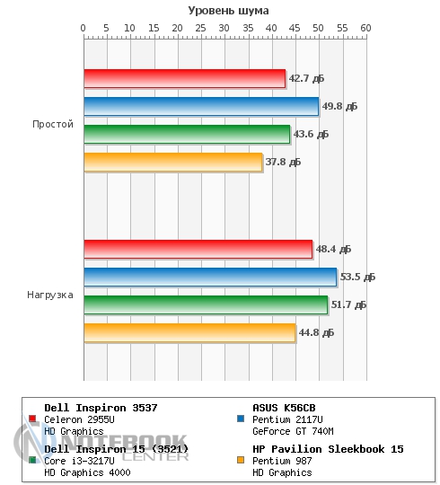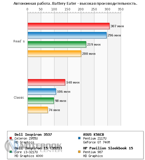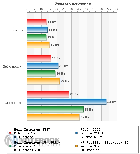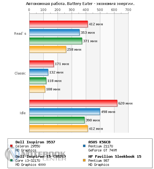 Ноутбук практически не шумит в состоянии простоя, выдавая максимум 42.7 дБ. При нагрузке, за счет раскручивающихся кулеров, этот показатель поднялся до 48.4 дБ, но и это приемлемый результат. Ниже представлен график, на котором можно сравнить уровень издаваемого шума такими ноутбуками как: Dell Inspiron 3537, ASUS K56, Dell Inspiron 15 (3521) и HP Sleekbook. ![]() БатареяDell Inspiron 15 (3537) оснащен 4-секционной литий-ионной батареей емкостью 2700 мАч. Сразу стоит сказать, что она не очень емкая в сравнении с другими моделями, но энергосберегающие компоненты должны компенсировать этот недостаток. ![]() Заряжается ноутбук с помощью 65-ваттного блока питания. Время зарядки составляет 3 часа 24 минуты, что сравнительно долго. ![]() Для тестирования времени автономной работы мы использовали утилиту Battery Eater. Сначала мы установили план электропитания «Высокая производительность». В режиме «Classic» Dell Inspiron 3537 продержался 2 часа 20 минут, а в режиме «Read's» – 5 часов 7 минут. График сравнения автономного времени работы в плане электропитания «Высокая производительность» показал, что наша модель является самой «живучей» среди представленных в тесте. Также стоит отметить ASUS K56, который, несмотря на дискретную графику, смог вплотную приблизиться к Dell Inspiron 3537 в тесте «Read's». ![]() В плане электропитания «Экономия энергии» показатели автономного времени работы ожидаемо выросли. Так, в режиме «Classic» ноутбук проработал 2 часа 51 минуту, а в «Read's» – 6 часов 52 минуты. Самое продолжительное время работы было зафиксировано в режиме простоя, оно составило 10 часов 20 минут. Dell Inspiron 3537 только укрепил свои позиции относительно конкурентов в плане электропитания «Экономия энергии». Так, отрыв от ближайших преследователей в режимах «Read's» и «Classic» составил 40 минут, а в режиме простоя, целых 2 часа! ![]() Кроме этого, мы произвели замеры потребления электроэнергии с помощью мультиметра. Результаты получились следующими: простой – 13 Вт, веб-серфинг – 16 Вт и самый «прожорливый» режим нагрузки, который был имитирован с помощью стресс-теста, показал 28 Вт. На графике видно, что наша модель является самой экономной среди всех представленных. Впрочем, у всех ноутбуков потребление практически одинаковое, только ASUS K56 снова из-за своей дискретной видеокарты показал наибольший результат в режиме стресс-теста. ![]() ЗаключениеПодводя итог, можно сказать, что Dell Inspiron 3537-8034 достойный аппарат за свою стоимость. Он действительно способен очень успешно трудиться в офисе благодаря своей неплохой производительности, эргономичной клавиатуре и хорошему набору коммуникаций. Также он будет отлично исполнять роль развлекательного центра у вас дома, так как в его распоряжении неплохой бюджетный дисплей и громкая акустика. Если же вы часто ездите в поездки или вам требуется простой и неприхотливый ноутбук для учебы, то Dell Inspiron 3537 будет удачным выбором за счет своих габаритов и длительного времени автономной работы. В целом, Dell Inspiron идеально воплощает в себе идеологию стиля casual, являясь удобным и практичным гаджетом на каждый день. Дата: 04.08.2014
