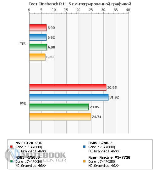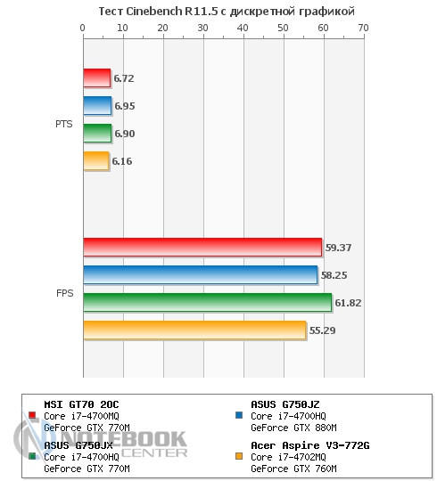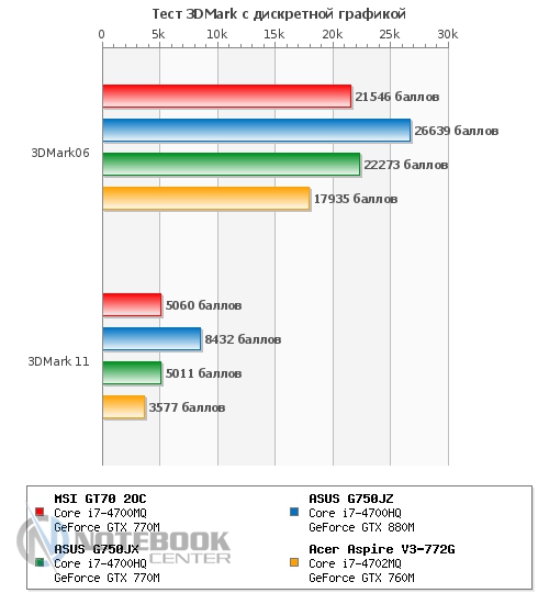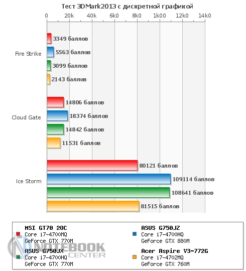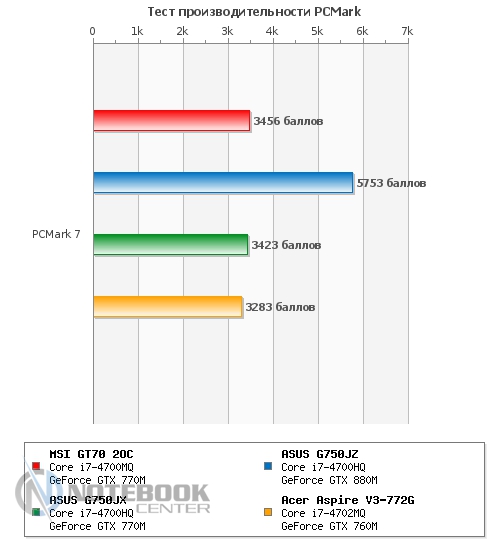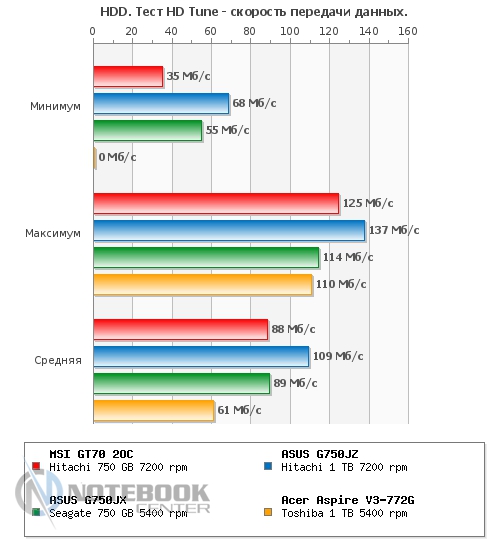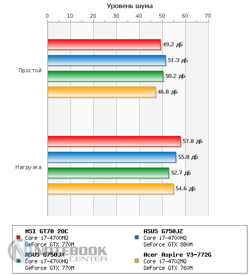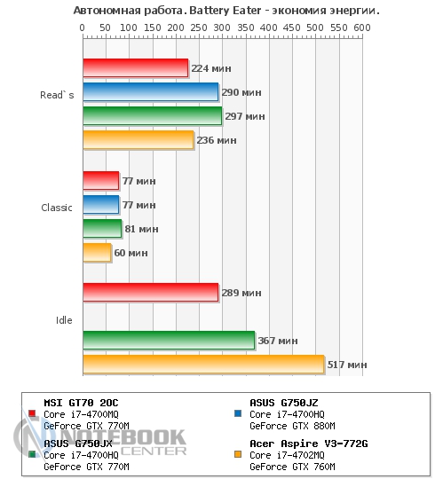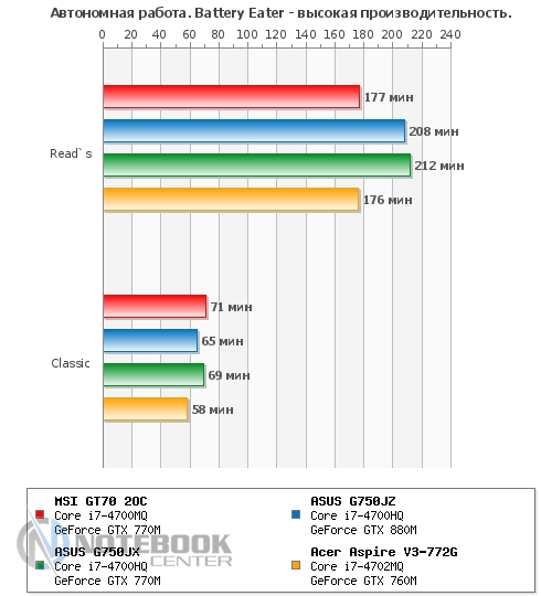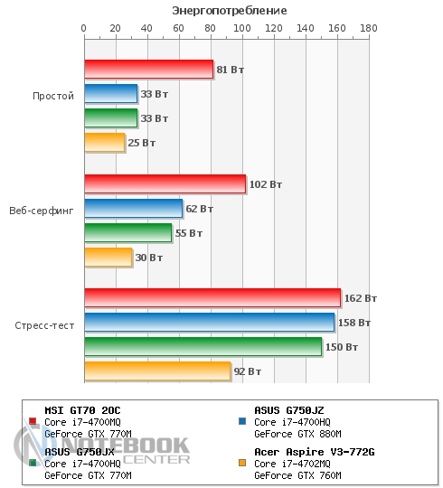 Также мы замерили уровень шума, создаваемого MSI GT70. В состоянии простоя он составил 49.2 дБ, а под нагрузкой – 57.8 дБ. Если в первом случае, наша тестовая модель практически ничем не отличается от других ноутбуков, представленных на графике, то под нагрузкой она на несколько дБ шумнее своих конкурентов. Это связано с тем, что при замере мы активировали технологию Cooller Boost вследствие чего кулер начал крутиться на максимальных оборотах и создавать гул, сравнимый по громкости с пылесосом или сушилкой для рук. ![]() БатареяЗа автономность в этом ноутбуке отвечает довольно большой и нестандартный по форме 9-секционный литий-ионный аккумулятор емкостью 7800 мАч. Он легко снимается, для этого нужно отщелкнуть всего две защелки, после чего он может быть заменен или просто демонтирован. ![]() Заряжается ноутбук 180-ваттным блоком питания поистине исполинских размеров, который весит 661 грамм. Хотя у того же ASUS G750VW блок питания весит еще больше – 710 грамм. От ноля до полной зарядки ноутбуку требуется 2 часа 50 минут, что является средним по длительности показателем. ![]() Автономность ноутбука мы измеряли с помощью утилиты Battery Eater. В плане электропитания «Экономия энергии» в режиме «Classic» MSI GT70 2OC показал 1 час 17 минут. В режиме «Read's» он продержался дольше – 3 часа 44 минуты. Максимальное время работы ноутбук продемонстрировал в простое – 4 часа 49 минут. Если сравнивать эти показатели с другими моделями, то MSI держался с ними наравне только в режиме «Classic», в чтении и простое он заметно проиграл двум игровым моделям от ASUS. ![]() Также был проведен тест батареи в плане электропитания «Высокая производительность». В режиме «Classic» мы получили 1 час 11 минут, что всего на 6 минут отличается от такого же значения, но в плане электропитания «Экономия энергии». А вот в режиме «Read's» результаты оказались гораздо скромнее – всего 2 часа 57 минут, что на целых 45 минут меньше, чем в экономном. При высокой производительности в режиме чтения, ноутбуки расположились парами, первое место поделили модели от ASUS, а второе – MSI и Acer. А вот в режиме «Classic» наша тестовая модель все-таки выбилась в лидеры, хоть и с очень небольшим отрывом. ![]() Энергопотребление данного ноутбука нас несколько удивило. Так, к примеру, в состоянии простоя он потребляет больше чем многие ноутбуки под нагрузкой, а именно 81 Вт, для сравнения более мощный ASUS G750JZ – всего 33 Вт. При веб-серфинге разрыв в значениях несколько сократился, но и тут 102 Вт у MSI GT70 кажутся перебором по сравнению с 62 Вт у ASUS G750JZ и 55 Вт у ASUS G750JX. А вот под нагрузкой энергопотребление всех трех игровых моделей практически сравнялось. Единственным ноутбуком, который выбился из общей картины, стал мультимедийный Acer Aspire V3-772G. ![]() ЗаключениеMSI GT70 по-настоящему игровой и мощный ноутбук, который станет желанным гостем не только на столе у геймера, но и у любого человека, который ценит высокую производительность, качество и стиль. Хочется отметить высокую гармоничность данного лэптопа, в нем все максимально сбалансировано и продумано. Связка четырехъядерного процессора Intel Core i7-4700MQ и игровой видеокарты NVIDIA GeForce GTX 770M обеспечивают комфортную игру даже в самых требовательных играх, причем не на низких, а на средних и высоких настройках с родным разрешением 1920х1080 пикселей. Отдельно хотелось бы отметить удобную клавиатуру и богатый набор коммуникаций, который не 
