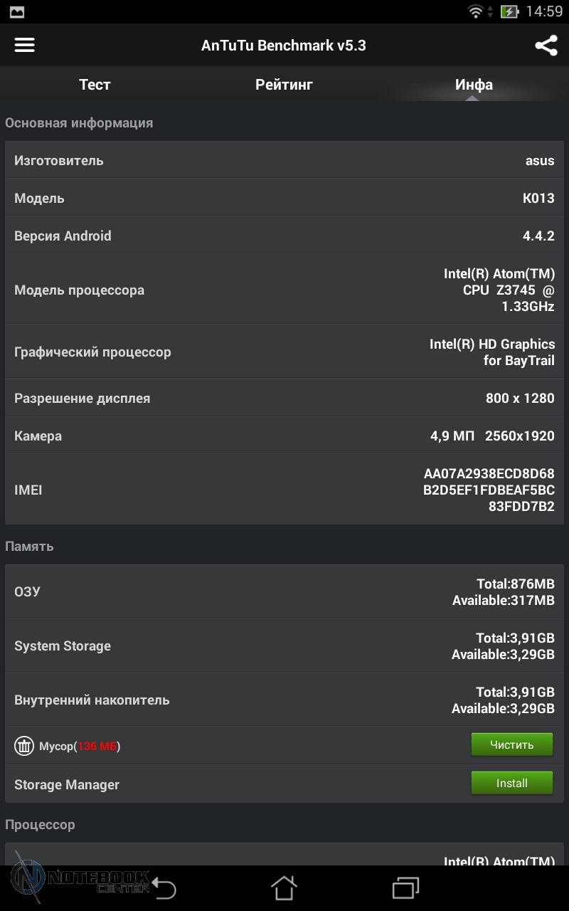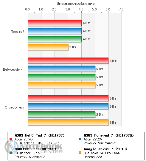 БатареяПланшет укомплектован 3-секционной литий-полимерной батареей емкостью 15 Втч. Учитывая энергоэффективную начинку, небольшое разрешение и компактность экрана, она должна обеспечивать приличную автономность. На деле получаем 4 часа 20 минут в режиме игр и 7 часов 40 минут в режиме видео (использовали Full HD-видео в условиях максимальной яркости и при включенном Wi-Fi). Отличный результат для бюджетного сегмента – практически пол дня активности без ограничений. Правда заряжается батарея до 100% долговато – 3 часа 40 минут. ![]() В вопросе энергопотребления МеМо Pad 7 находится наравне со своими одноклассниками. В простое, интернет-серфинге и при запуске стресс-теста мы получили 4, 6 и 6 Вт соответственно. ![]() ЗаключениеASUS МеМо Pad 7 (МЕ176С) – это очень достойный планшет. В нем нет излишеств, как технических, так и дизайнерских, однако ошеломляющие цифры на ценнике также отсутствуют. Ординарная внешность и некоторая массивность скрадываются ярким цветом корпуса, в довольно широкой цветовой линейке, предложенной производителем. Нет сомнений, что новая платформа Intel Bay Trail хорошо вписывается в бюджетный таблеточный сегмент. Memo Pad ASUS 7 МЕ176С демонстрирует отличные результаты тестов, успешно справляясь с различными задачами, в том числе и с играми. Печалит только 1 ГБ ОЗУ и малый объем внутренней памяти, но последний момент хотя бы корректируется карточкой памяти. Несмотря на наличие нескольких слабых мест, протестированный планшет предлагает ключевые факторы: хорошую производительность, автономность, дисплей, ну и, конечно, стоимость. Это не победитель, но в своей категории, несомненно, заслуживает пристальное внимание. Благодарим представительство ASUS в Украине www.asus.ua за любезно предоставленный для тестирования планшет. Дата: 11.12.2014