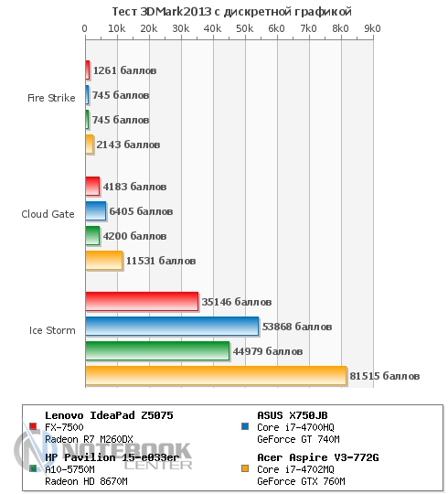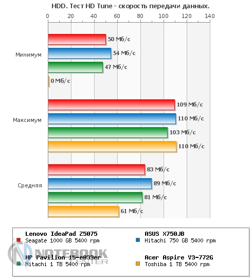 Назвать ноутбук тихим не получится даже в простое, поскольку система охлаждения работает довольно активно, и в этом случае уровень шума составляет 50.6 дБ. Под нагрузкой показатель чуть больше – 53.2 дБ. Многие лэптопы, в частности, игровые, имеют аналогичный уровень шума, так что ничего критичного в этом нет. В доказательство на графике видно, что и в простое, и под нагрузкой уровень шума у выбранных моделей практически одинаковый. ![]() БатареяВ ноутбуке установлена 4-секционная литий-полимерная батарея Lenovo PABAS0241231 емкостью 2800 мАч (41 Втч). Ее тестирование с помощью Battery Eater показало не слишком высокие результаты, например, максимальная автономность устройства составляет 7 часов 24 минуты в простое. Другие показатели гораздо меньше. Так, в плане электропитания «Экономия энергии» в режиме «Read’s» время работы ноутбука от аккумулятора не превышает 4 часов 51 минуты, тогда как в «Classic» – 1 часа 18 минут. На графике видно, что во всех режимах, кроме «Idle», Lenovo IdeaPad Z5075 идет более-менее на равных с остальными ноутбуками. ![]() К сожалению, при установке плана электропитания «Высокая производительность» автономность предсказуемо ниже. Через 3 часа 30 минут ноутбук разрядится в режиме «Read’s», а в «Classic» и того меньше – за 1 час 13 минут. Как видим, продолжительность работы устройства без подзарядки от сети не является его козырем. Впрочем, если сравнивать с другими ноутбуками, то Lenovo IdeaPad Z5075 на их фоне выглядит довольно неплохо. В «Classic» его результат наилучший, а вот в «Read’s» – он уступает ASUS X750JB и HP Pavilion 15-e033er не более получаса. ![]() Для зарядки аккумуляторной батареи используется 65-ваттный блок питания. Сам процесс длится не более 2 часов 43 минут. ![]() Энергопотребление ноутбука относительно небольшое. В простое – 19 Вт, при веб-серфинге – 30 Вт. А вот при запуске FurMark и стресс-теста AIDA, т.е. при высокой нагрузке, потребление энергии возрастет до 38 Вт, хотя для устройства такого класса это хороший результат, что подтверждается графиком. Пускай в простое показатель 19 Вт не самый низкий, зато в стресс-тесте IdeaPad Z5075 потребляет энергии гораздо меньше, чем тот же Acer Aspire V3-772G. ![]() ЗаключениеВ целом Lenovo IdeaPad Z5075 оставил приятное впечатление. Он оснащается Full HD-дисплеем и отличной клавиатурой, да и начинка от AMD довольно уверенно справляется со многими задачами. В то же время, по результатам тестов видно, что данный ноутбук все-таки далек от производительности геймерских моделей, и для требовательных современных игрушек его не хватит. Однако стоимость устройства вполне лояльная – около $750, поэтому на него стоит обратить внимание тем, кто ищет мультимедийную модель для ежедневного досуга. Благодарим компанию AMD за любезно предоставленный для тестирования ноутбук. Дата: 10.04.2015