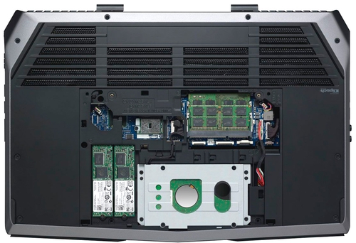 ДизайнНачнем, как водится, с внешнего вида. Корпус устройства изготовлен из углеродного волокна, невероятно прочного, ведь его применяют даже в авиационно-космической отрасли, а это говорит о многом. Крышка сделана в сером цвете, в дизайне присутствуют четкие линии, которые делят ее поверхность на три сегмента. В верхней части крышки – небольшое изображение пришельца, которое красноречивее любых символов и логотипов. ![]() Спереди ноутбук не менее консервативен: те же четкие рубленые линии и ни намека на «попсовость». Экран окружает рамка, размеры которой отличаются в зависимости от грани. Например, в нижней части она очень широкая, вероятно, для того чтобы инженеры беспрепятственно поместили там надпись «Alienware». Вверху рамка сильно сужена и выполнена в форме домика. Там же – небольшой глазок веб-камеры. Рабочая поверхность располагает эргономичной клавиатурой, под которой разместился весьма компактный тачпад. Боковые грани Dell Alienware A15 – массивные и широкие, но это лишь удачно дополняет общую концепцию устройства. К слову, подсветка ноутбуков данного сегмента – одна из многочисленных «фишек». При включении гаджета одновременно начинает светиться пришелец на крышке, а также две линии, которые идут от него, как лучи. Подсвечивается надпись «Alienware», клавиатура, кнопка питания, тачпад, а также весь периметр нижней части корпуса. Смотрится все это просто потрясающе, такое вот небольшое представление перед большой игрой. ![]() На днище большое количество площади отведено под вентиляционные отверстия, что, в общем-то, даже хорошо, учитывая игровую направленность устройства. Что касается качества сборки лэптопа, то оно, как вы уже, наверное, догадались, просто на высоте! Ноутбук выполнен на славу, его корпус не прогибается, не трещит и не люфтит. Шарнирный механизм срабатывает четко, в меру туго. ![]() Конечно, рассчитывать на то, что игровой лэптоп будет легким и тонким не приходится, все же это не тот случай. Хотя, справедливости ради, отметим, что многие производители уже начали работать в таком направлении, взять хотя бы 15-дюймовый ASUS G501JW. Если же говорить о нашей модели, то ее габариты – 384х270х34 мм, а вес равен 3.2 кг. Да уж, далеко с таким устройством не уйдешь, но оно на это и не рассчитано. Дисплей, звук и веб-камераЭкран Dell Alienware A15 выпускается в двух вариантах: Full HD и Ultra HD 4K (3840х2160), который, к тому же, еще и сенсорный. Выбранная нами комплектация – более скромная, в числе ее характеристик – 15.6-дюймовая диагональ, разрешающая способность – 1920х1080 точек, IPS-матрица, матовая поверхность. Дисплей порадует своего пользователя широкими углами обзора, которым не страшна инверсия; сочным и реалистичным изображением, с высоким уровнем контрастности и яркости (до 300 кд/м2). Еще одним достоинством является антибликовое покрытие, которое позволяет поиграть у окна без ущерба качеству игры. ![]() В ноутбуке используются технологии Klipsch и Creative SoundBlaster X-Fi, направленные на достижение высокого уровня звучания. Два динамика, расположенные в передней части гаджета, демонстрируют отличный результат, ведь звук на выходе получается четкий и объемный. С громкостью также все в порядке, на максимуме звучание не портится, хрипы не наблюдаются. В общем, для прослушивания музыки или просмотра фильмов акустики будет достаточно, а вот для того чтобы сделать игру максимально р