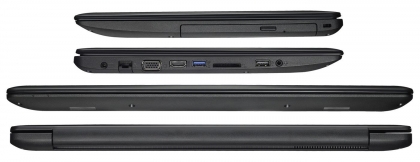 ДизайнВ вопросе внешнего вида ASUS R515MA мало чем отличается от массы бюджетных ноутбуков – незамысловатый дизайн, практичные темные тона оформления корпуса и присутствие только самых необходимых элементов управления. ![]() Матовая крышка черного цвета традиционно украшена логотипом производителя на самом видном месте – в центре. Поверхность имеет чуть рифленую поверхность, за счет чего отпечатки пальцев не особо задерживаются. Массогабаритные характеристики устройства весьма сдержанны, что, безусловно, только плюс. Ноутбук весит около 2.2 кг, его размеры составляют 380х251х30 мм. Качество сборки можно оценить выше среднего, так как недочеты есть, к примеру, не настолько прочный пластик, как хотелось бы. ![]() Днище корпуса пустует из-за отсутствия функциональных и декоративных элементов. Здесь только резиновые опорные ножки в количестве четырех штук, винты крепления, углубленные в панель, и два динамика, оформленные в небольшие площадки с горизонтальным сечением. ![]() Дисплей, звук, веб-камера15.6-дюймовый глянцевый дисплей имеет разрешение 1366х768 пикселей. Он изготовлен по технологии TN + Film и обладает весьма ограниченными углами обзора. В целом, с таким экраном работать вполне удобно, хотя блики при ярком освещении очень мешают, учитывая, что ASUS R515MA рассчитан и на использование вне дома. Хотелось бы, чтобы ноутбук демонстрировал увеличенный запас яркости и более качественную цветопередачу, так как, к примеру, черный цвет выглядит серым. Подсветка неравномерна, что в особенности заметно в нижней части дисплея. ![]() За акустику отвечает технология SonicMaster, за вывод звука – два динамика, расположенных на днище корпуса. По качеству звучания ASUS R515MA, пожалуй, можно поставить троечку, так как громкости не хватает, басы отсутствуют. Тем более что на максимальной громкости звук заметно искажается и дребезжит. Веб-камера ноутбука имеет разрешение всего 0.3 Мп. Картинка при видеосвязи будет не слишком качественной – темной и зернистой, но для бюджетного устройства это вполне закономерно. ![]() Клавиатура и тачпадОстровная клавиатура в ASUS R515MA довольно компактна и занимает ограниченную территорию рабочей площадки, несмотря на наличие нампада. Кнопки расположены друг от друга на приличном расстоянии, они черного цвета, со стандартной белой маркировкой и приятно скругленными углами. Клавиши стрелочного блока, как ни странно, полноразмерные, что приятно и, несомненно, только плюс для ноутбука. Кнопки имеют хорошую отдачу при нажатии, приятный ход; подложка достаточно прочная, поэтому не прогибается при активном печатании или играх. Иными словами, клавиатура в ноутбуке очень удачная, заметно, что производитель продумал буквально каждую мелочь. ![]() Сенсорная площадка достаточно крупная, четко очерченная и представляет собой весьма функциональное устройство ввода. Поддерживая жесты мультитач, тачпад не всегда корректно выполняет заданное действие, хотя чувствительность на достойном уровне. На ощупь поверхность манипулятора чуть шероховатая и нескользкая, мышиные кнопки скрыты за сплошной панелью, обозначаясь лишь вертикальной полоской-границей. ![]() ПроизводительностьКупить ноутбук Асус R515MA (R515MA-SX688B) можно с предустановленной операционной системой Windows 8.1. В основе лэптопа лежит энергоэффективный двухъядерный процессор Intel Celeron N2840 мощностью нача