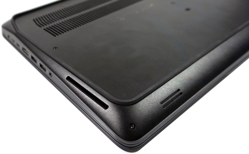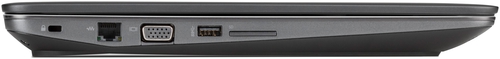 На левой грани находится еще один порт USB 3.0, с помощью которого также может осуществляться зарядка, видеовыход VGA, сетевой разъем RJ-45, кардридер 3-в-1 (SD/SDHC/SDXC) и, наконец, слот для замка Кенсингтона. Передний и задний торец пустуют. Как видите, производитель отказался от оптического привода и док-разъема. Вместо порта для подключения док-станции ноутбук получил целых два Thunderbolt.