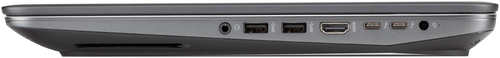 Так как речь идет о мобильной рабочей станции, набор интерфейсов должен быть, как минимум, впечатляющим. Что ж, посмотрим: на правой стороне имеются два порта USB 3.0, два порта Thunderbolt 3, видеовыход HDMI, считыватель смарт-карт, комбинированный аудиоразъем и разъем питания.