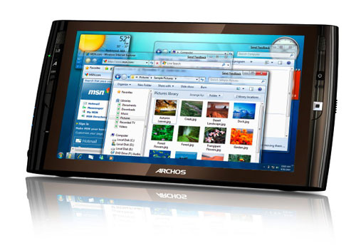 Archos 9 PC tablet – интернет-планшет с предустановленной системой Windows 7 Starter Edition. Сенсорный дисплей с диагональю 8.9 дюймов и разрешением 1024х600 пикселей, с виртуальной QWERTY-клавиатурой и возможностью проигрывать видео full HD. Это устройство уже в продаже: его стоимость 550 долларов, что на $50 выше заявленной цены. За эти деньги Вы получите нетбук с процессором Intel Atom Z510 (1,1 ГГц), 1 Гб ОЗУ и винчестер на 60 Гб. Функциональный набор действительно схож с набором интерфейсов ноутбука: 3,5-миллиметровый аудио-разъём, порт USB 2.0, Веб-камера 1.3 Мегапикселя.