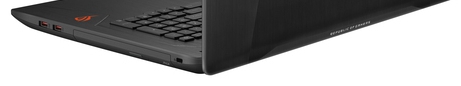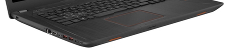 ДизайнДовольно компактный корпус, толщиной 30 мм и весом 2.8 кг, для практичности защищен тонким алюминиевым листом черного цвета. А уже в контраст всему на крышке размещены пара декоративных полосок и логотип ROG, которые во время работы подсвечиваются. Верхняя панель корпуса достаточно жесткая, при давлении она не прогибается. Алюминием так же защищена рабочая зона лэптопа, а все остальные элементы выполнены из пластика. К примеру, днище, где, помимо резиновых ножек оранжевого цвета, расположены решетки вентиляции. ![]() Пара небольших петель, выглядящих ограниченно на ребре 17-дюймового ноутбука, прочно держат крышку, да так, что одной рукой ROG Strix GL753VE не открыть. Они, кстати, тоже алюминиевые. Ширина и глубина устройства составляют 415х272 мм соответственно, изобилие декоративных элементов красно-оранжевого цвета не слишком хорошо справляются с задачей увеселения черного фона лэптопа, но лишними явно не выглядят. Вообще, данный игровой ноутбук можно назвать мрачноватым – не этого ли добивается производитель, намекая, что ROG Strix GL753VE способен провести в самые потаенные уголки хоррора и ужаса современных игр? ![]() Дисплей, звук, веб-камераВ лэптопе использована матрица IPS от LG с белой светодиодной подсветкой. 17.3-дюймовый дисплей получил высококачественное антибликовое матовое покрытие и разрешение 1920х1080 пикселей. Контрастность здесь достигает 700:1, максимальная яркость 363 кд/м2 (при заявленных 300 кд/м2 от производителя), минимальная – 21 кд/м2. Цветовое покрытие пространств sRGB и Adobe RGB очень и очень неплохое – 86.9% и 63.6% соответственно. В ROG Strix GL753VE стабильные цвета и хорошая цветопередача, что свойственно многим игровым лэптопам всех ценовых категорий. Углы обзора, при наличии матрицы IPS, логично широчайшие, как по горизонтали, так и по вертикали, что в целом, достойно завершает список характеристик дисплея. ![]() В корпус ноутбука установлены два динамика – на фронтальном скосе корпуса. Максимальный уровень громкости достаточен для помещения средних размеров, при этом, стоит отметить, что звук не искажается и не дребезжит. Он насыщенный по всем параметрам, но явно не хватает басов, и это удел, пожалуй, 99% лэптопов. Если надеть наушники или использовать внешнюю колонку, то качеством звучания можно остаться довольным полностью. ![]() Веб-камера HD расположена в верхней части рамки, вместе с парой микрофонов. ![]() Клавиатура и тачпадОстровная мембранная клавиатура выглядит очень компактной на довольно большом пространстве рабочей зоны лэптопа. И это учитывая наличие нампада и полноразмерных клавиш стрелочного блока! Она выполнена в более темном тоне, чем подложка, но черный цвет на черном все равно сливается, хотя раскладка контрастно белая и спасает ситуацию. Размеры кнопок составляют 15.5х15.5 мм, они квадратной формы и расположены на приличном расстоянии друг от друга. Здесь есть подсветка RGB, которая регулируется в три уровня, и визуальное выделение кнопок WASD – их грани белого цвета и полупрозрачны. Играть и печатать на ROG Strix GL753VE одно удовольствие, нет шума, есть заметное подпружинивание клавиш, приятный тактильный контакт и прочная подложка, не прогибающаяся при активных нажатиях. ![]() Кликпад так же небольшой, как и сама клавиатура. Он чуть притоплен в корпус и дополнительно отграничен полоской красного цвета по периметру. Работает устройство в