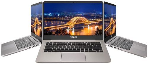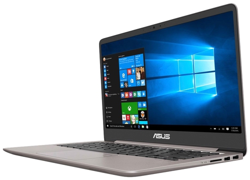 ДизайнДва момента, которые неизменно присутствуют в лэптопах линейки: металл в корпусе и концентрические круги на крышке. Герой нашего обзора изготавливается из алюминия, исключение – пластиковая рамка вокруг дисплея. В линейке предусмотрено два цвета – серый кварц (Quartz Grey) и розовое золото (Rose Gold). Оба немаркие – отпечатки пальцев и пыль на поверхностях практически незаметны. Вышеупомянутые концентрические круги – изюминка дизайна, добавляет элегантности и изысканности. Посередине крышки расположен хромированный логотип бренда. ![]() Шарнирная петля не очень тугая, за счет чего верхнюю часть лэптопа можно поднять одной рукой. Угол раскрытия крышки составляет примерно 120 градусов – маловато для ультрабука. У дисплея узкие боковые рамки. Клавиатура удобна для набора текста, подладонная поверхность просторная, поэтому рукам комфортно. На днище предусмотрено четыре резиновые ножки, чтобы устройство не скользило. Открутив 12 винтиков, получите доступ к ОЗУ, жесткому диску, твердотельному накопителю. ![]() Качество сборки было бы отменным, но картину испортила задняя панель: она легко скручивается и если несильно тряхнуть ноутбук, крышка заваливается. В остальном все хорошо: нет зазоров, люфтов, клавиатура не прогибается. Размеры девайса следующие: 323х223х19 мм, вес равен 1.4 кг. Учитывая 14-дюймовый форм-фактор, лэптоп получился компактным и легким. ![]() Дисплей, звук и веб-камераЭкран имеет диагональ 14 дюймов и Full HD-разрешение. Максимальная яркость – 335 кд/м2, коэффициент контрастности равен 770:1. Это хорошие показатели, поэтому на выходе получаем яркую и реалистичную картинку. Соответствие цветовому пространству sRGB составляет 100%, Adobe RGB – 78%, NTSC – 72%. Таким образом, дисплей подходит для полупрофессиональной обработки фото. ![]() Поверхность экрана матовая и теоретически солнечные лучи ей не страшны, да и хороший запас яркости делает свое дело. Матрица IPS гарантирует широкие углы обзора – до 178 градусов, поэтому цвета не инвертируются ни под каким ракурсом. ![]() Два стереодинамика Harman/Kardon находятся на днище устройства, ближе к переднему краю. Их возможностей достаточно для фонового прослушивания музыки, просмотра фильмов – звучание не очень громкое. На максимуме звук не хрипит и не искажается. Низкие частоты – слабое место динамиков. Веб-камера с разрешением 720p подходит для видеообщения, несмотря на то, что изображение получается нечетким и тусклым. Клавиатура и тачпадКлавиатурный блок островного типа немного утоплен в поверхность. Кнопки квадратной формы, крупные, с белой маркировкой на черном фоне. Ход клавиш длинный (1.6 мм), отдача ощутимая, во время печати клацанье едва слышно. Имеется подсветка с тремя уровнями яркости, что упрощает использование ноутбука ночью или при плохом освещении. ![]() Расположение кнопок обычное, по крайней мере, для линейки ZenBook. Клавиша [Enter] однорядная, под ней – вытянутая кнопка [Shift], с противоположной стороны находится ее сестра, но чуть меньшего размера. Компактным стрелочным блоком давно никого не удивить, так же, как и кнопкой включения лэптопа в правом верхнем углу. У крупного тачпада пластиковая, слегка шероховатая поверхность – по ней удобно водить пальцами. Манипулятор безошибочно распознает мультитач-жесты, срабатывает оперативно. Физические клавиши встроены в поверхность, нажимаются негромко, чет