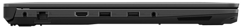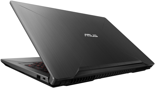 ДизайнМодель полностью изготавливается из пластика, дизайн которого имитирует металл. В данном случае пластиковая оболочка не выглядит дешево – материал качественный и смотрится стильно. Поверхность корпуса матовая и не слишком восприимчивая к пыли и отпечаткам пальцев. Посередине крышки расположен логотип ASUS крупного размера, из четырех углов к нему тянутся наклонные линии. Такая деталь делает корпус изысканным и привлекательным, а внешний вид девайса – запоминающимся. ![]() Две шарнирные петли в меру тугие: крышка поднимается без труда, но для этого низ лэптопа нужно придерживать одной рукой. Дисплей окружен довольно толстыми рамками. На верхней грани – объектив веб-камеры, снизу – небольшой логотип бренда. Полноразмерная клавиатура с цифровым блоком выглядит продуманной и удобной. Дизайн рабочей зоны перекликается с внешним видом крышки – те же рубленые линии и шлифованная поверхность. ![]() Интерфейсы расположены неравномерно – большая часть находится на левой грани. Перед многими конкурентами ноутбук ASUS FX503VD выигрывает в весе – 2.5 кг – против других игровых лэптопов, чей вес нередко достигает 4 кг. Размеры модели составляют 384х262х24 мм, поэтому девайс легко поместится в небольшую сумку. Качество сборки устройства нам понравилось: нет люфтов, скрипов, прогибов. Дисплей, звук и веб-камера15.6-дюймовый экран получил разрешение 1920х1080 пикселей с плотностью точек 141 ppi. Максимальный показатель яркости не превышает 300 кд/м2. Цветопередача естественная, картинка на дисплее выглядит реалистичной. Экран не сенсорный. ![]() Матрица IPS обеспечивает широкие углы обзора – до 178 градусов. Это означает, что независимо от ракурса видны все детали во время игрового процесса, а оттенки не инвертируются. У дисплея присутствует антибликовое покрытие, но за счет небольшого запаса яркости играть или работать возле окна либо на улице будет некомфортно. ![]() Два стереодинамика с технологией SonicMaster расположены на боковых гранях корпуса. Они издают громкий звук без хрипов и искажений на максимуме. Звучание сбалансированное, во всяком случае, для игровых сессий соотношение низких и высоких частот нормальное. Для улучшения акустики можно подключить наушники или внешнюю колонку. Встроенный микрофон также заслуживает внимания: он фильтрует внешний шум, обеспечивая четкий звук даже в шумной среде. Веб-камера с разрешением 1 Мп подходит для видеочатов и общения по Skype. ![]() Клавиатура и тачпадПолноразмерная клавиатура островного типа оснащена квадратными кнопками среднего размера. Клавиши черные, красная маркировка хорошо с ними контрастирует, хотя с белым цветом было бы еще лучше. Клавиатурный блок немного утоплен в поверхность, поэтому соприкасаться с экраном, когда ноутбук в закрытом состоянии, не будет. Присутствует яркая красная подсветка, кнопки [W], [A], [S], [D] выделены дополнительно для безошибочного попадания во время игрового процесса. ![]() Ход клавиш средний (1.8 мм), обратная связь ощутимая, кнопки нажимаются без усилий. Часто нажимаемые клавиши – [Enter], [Shift], [CapsLock] – вытянутые и крупные. Стрелочный блок (его большая часть) вынесен отдельно, под нампад, чтобы не задеть близлежащие кнопки. В целом, клавиатура ноутбука продуманная и удобная, руки не устают даже после целого дня печатанья. У тачпада четкие границы и гладкая поверхность, по которой прия