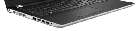 Разъемы ноутбука HP 15-bw066ur разнесены по боковым поверхностям корпуса, тогда как передний и задний скос остались пустыми. Слева находятся два USB 3.0, HDMI, RJ-45, комбинированный аудио и гнездо для зарядного устройства.