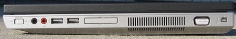Вид справа: wireless on/off переключатель, выход для наушников и вход для микрофона, Express Card слот, вентиляционные отверстия, выход на монитор и Fire Wire порт.