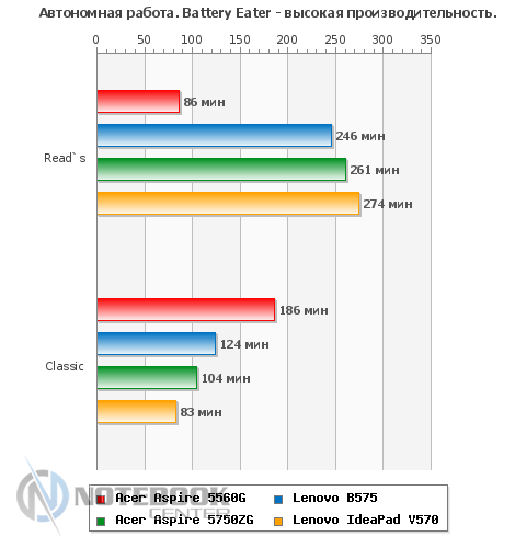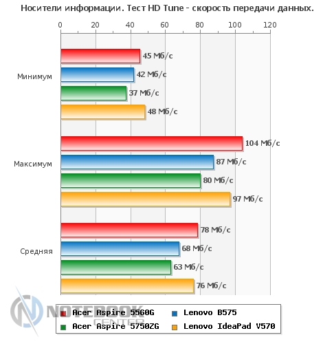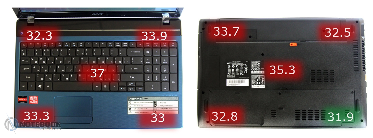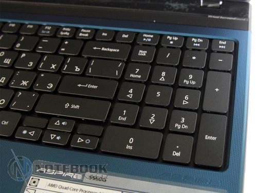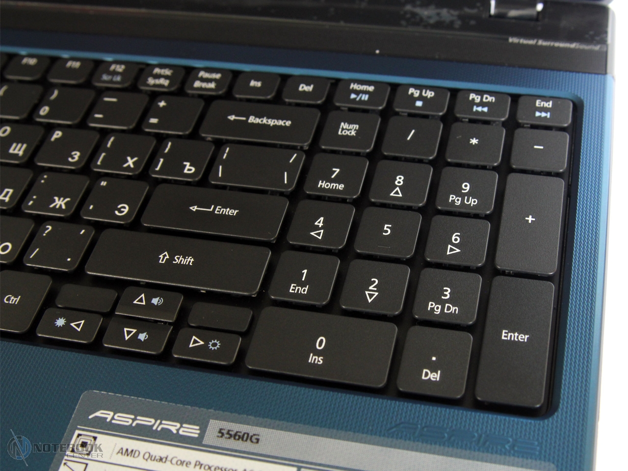 Комплект поставкиНоутбук попал к нам в небольшой коробке с удобной ручкой. В коробке кроме самого Acer Aspire 5560G находился 90-ваттный блок питания с кабелем, руководство пользователя, список пользовательских лицензий, а также 6-секционная батарея. ![]() ДизайнAcer Aspire 5560G выглядит довольно стильно и молодежно, слегка закругленные края создают общий гармоничный и приятный образ. ![]() Корпус выполнен из качественного пластика двух типов. Гладкий матовый пластик используется в изготовлении основания, а вот другой тип пластика имеет текстурную поверхность – из него то и выполнена верхняя крышка и внутренняя поверхность вокруг клавиатуры. Кроме матовых поверхностей в дизайне ноутбука также использовано глянцевое покрытие вокруг дисплея и тонкая линия над решеткой динамиков. ![]() К нам на обзор попал ноутбук в синем цветовом исполнении, такой лэптоп предпочтет скорее молодое поколение. Кроме синего цветового исполнения Acer Aspire 5560G также производится в черном цвете, он больше подойдет для деловых людей и корпоративных решений. ![]() Корпус ноутбука довольно прочный и почти не прогибается. Верхняя крышка Acer Aspire 5560G крепится к основанию двумя петлями, которые утоплены в основание ноутбука. Если рассматривать днище Acer Aspire 5560G, то тут можно найти решетки вентиляции расположенные над основными компонентами ноутбука. Для устойчивого расположения ноутбука на поверхностях используются четыре достаточно больших резиновых ножки, расположенных по периметру. Система фиксации аккумулятора довольно надежная, чтобы извлечь батарею нужно вооружиться каким-либо заостренным предметом, или если вы имеете тонкие и сильные пальцы, то можно попытаться открыть и ими. ![]() Acer Aspire 5560G представляет собой мультимедийный или универсальный ноутбук, который имеет хорошую начинку и 15.6-дюймовый дисплей, это сказывается на весе и габаритах, ноутбук весит 2.59 кг. Габариты Acer Aspire 5560G составляют 382x253x33.2мм. Дисплей и звукДанный ноутбук располагает глянцевым 15.6-дюймовым широкоформатным дисплеем LG Philips LP156WH4-TLA1. Максимальное разрешение составляет 1366х768 пикселей при соотношении сторон 16:9. ![]() Качество данного дисплея находится на вполне хорошем уровне, яркость и контрастность позволяют комфортно работать за ноутбуком. В целом характеристики данного дисплея ничем особенным не отличаются и почти такие же, как у аналогичных моделей компании Acer и моделей конкурентов. Что касается углов обзора, то назвать их хорошими не получится, цвета сильно инвертируются как при отклонении «от себя» так и «на себя», изображение нечитаемое. С горизонтальными углами дела обстоят чуть лучше, но все-таки до уровня дорогих дисплеев ему далеко. ![]() ![]() Как и в большинстве современных ноутбуков, здесь установлена веб-камера, которая может снимать видео в HD формате. Также с помощью этой камеры можно общаться через интернет и создавать видеоконференции по работе или просто общаться с друзьями. Встроенный микрофон находиться в правом верхнем углу правее от веб-камеры. ![]() Два стереодинамика, отвечающих за воспроизведение музыки и звуков на данном ноутбуке, расположены над клавиатурой. Данное решение является весьма привычным для многих ноутбуков. Звук в Acer Aspire 5560G нельзя назвать выдающимся, но для просмотра фильма, если у вас под рукой нет дополнительных динамиков, встроенные вполне подойдут. Еще одни