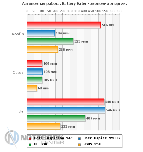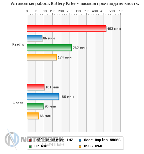 Комплект поставкиПришедший к нам на обзор Dell Inspiron 14z является инженерным образцом, это значит, что его комплектация может отличаться от тех, которые поступают в продажу. ДизайнНоутбук обладает весьма привлекательным дизайном, все контуры скруглены, острые грани отсутствуют. Корпус выполнен из алюминия, который окрашен в темно-коричневый цвет, но иногда может показаться, что он полностью черный. Смотрится такой корпус довольно стильно и аккуратно, но его поверхность достаточно маркая. На верхней крышке красуется логотип фирмы - заключенная в окружность надпись «DELL». ![]() Стоит отметить саму компоновку корпуса, его основа чуть больше чем верхняя крышка, поэтому она смещена больше к передней части, а пространство за петлями отведено под отсек для батареи. Дисплей крепится к основанию двумя надежными петлями, что обеспечивает достаточно жесткое сцепление и исключает его расшатывание. ![]() Днище ноутбука выполнено из черного пластика. На нем разместилась пара вентиляционных отверстий и отсек для доступа к внутренним компонентам, что делает замену памяти или винчестера довольно простыми. По краям днища размещены четыре резиновые ножки. ![]() Из минусов можно отметить недостаточную жесткость днища. Больше всего оно прогибается в области оптического привода. Также в сборке имеется недочет - крышка оптического диска не полностью прилегает к корпусу и там образуется большая щель. Батарея выступает за пределы корпуса, и приподнимает ноутбук над поверхностью. Размеры ноутбука средние, его габариты составляют 346х245х25 мм, а весит он 2.03 кг, носить с собой такой аппарат, думаю, не составит особых проблем. Дисплей и звукDell Inspiron 14z обладает 14-дюймовым дисплеем с глянцевым покрытием и разрешением 1366х768 пикселей. Если охарактеризовать его в двух словах, то это стандартная матрица, по характеристикам она не хуже и не лучше большинства аналогичных моделей, но встречались и более качественные 14-дюймовые модели. ![]() Что касается яркости и контрастности, то установленная в Inspiron 14z матрица является не самой качественной, поэтому их показатели не впечатлили. О высокой контрастности в данном случае говорить не приходится, этот показатель составляет 75:1. Яркость тоже стандартная для TN-матрицы, но стоит учесть, что данный ноутбук относится к бюджетному классу. Если говорит об углах обзора то тут не все так хорошо, к примеру, вы выставили оптимальный угол обзора и работаете за ноутбуком, но стоит вам чуть изменить свое положение, как сразу же начинается инвертация цветов. Особенно есть замечание к горизонтальным углам. ![]() ![]() Dell Inspiron 14z оборудован 1.3-мегапиксельной камерой и встроенным микрофоном. Вы сможете беспроблемно общаться через Skype или подобные программы со своими друзьями, близкими и коллегами. Также при желании можно делать и фотографии или снимать видео с разрешением 1280х720 пикселей. А для удобства пользования, компанией Dell предусмотрено приложение Dell webcam Central. ![]() Динамики расположены в передней части ноутбука на днище, и направлены под углом примерно 45 градусов вниз. Они закрыты овальными решетками, выполненными в общем стиле ноутбука. Звук соответствует качеству продукции выпускаемой компанией Dell. Уровень громкости довольно высок, а качество звучание и вовсе радует, потому что оно на уровне более дорогих моделей, хорошо выражены высокие и с