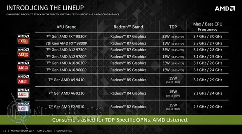 AMD представила на Computex 2016 процессоры нового поколения, основанные на ядрах Excavator. APU Bristol Ridge построены по нормам 28-нм технологии, но как заявляет производитель, техпроцесс значительно улучшен, а его оптимизация позволяет увеличить тактовые частоты. В данной линейке будут четырехъядерные процессоры FX, A10 и A12, дополненные графикой AMD Radeon R5/R7 и поддерживающие стандарт памяти DDR4. По производительности новые модели смогут конкурировать с Intel Core i5/Core i7 генерации Skylake. Что касается чипов Stoney Ridge, то они будут двухъядерными. Среди них: E2, A6 и A9.