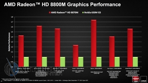 Чего же ждать от новинок в сегменте портативных устройств. Чипы серии 8000M можно будет встретить в паре с процессорами Intel или AMD, но вот в случае Trinity-системы есть некоторые нюансы. К примеру, в ноутбуке, где сочетается Trinity APU с дискретной графикой Radeon HD 8000M, устройство будет по-прежнему иметь возможность автоматически переключаться между дискретной и интегрированной графикой для того, чтобы сохранить энергию, но использовать одновременно две графики не выйдет, потому что два графических процессора будут основаны на различных архитектурах.
