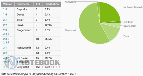 Судите сами, Android 4.1 можно встретить лишь на 1.8% активных устройствах с ОС от Google, это при ошеломляющем результате в 1.2% месяц назад! В течение двух недель до 1 октября 2012 года статистика на Google Play показала, что Gingerbread остается доминирующей платформой среди Android телефонов и планшетов. Ice Cream Sandwich в прошлом месяца была установлена на 20.9% устройств с Android, а теперь - на 23.7%.