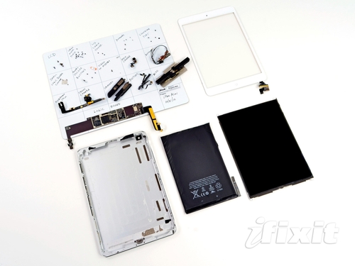 Под корпусом мини планшета были обнаружены: батарея емкостью 4400 мАч, дисплей производства Samsung, с которой Apple ведет бесконечные судебные разбирательства и сейчас жаждет разорвать всякие производственные отношения, также есть двухъядерный процессор Apple A5, память производства Hynix и две камеры.
