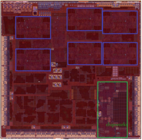 Схематически на плате два процессорных ядра выделены зеленым цветом, кластеры графической системы – голубым. Кэш L3 отсутствует.