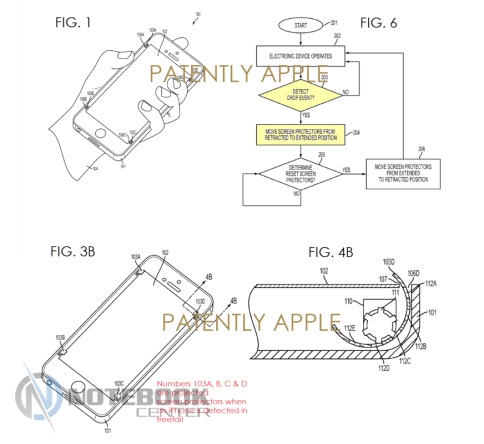 Фактически речь идет о специальных пазах, которые будут располагаться сбоку дисплея, т.е. на лицевой стороне. Именно из них в случае падения появятся выдвижные вставки, своего рода щиты, исполняющие роль амортизаторов. Интересно, что механизм, описанный в патенте, предполагает наличие под экраном iPhone четырех специальных моторчиков, которые при падении гаджета активизируют выносные вставки. Определяет момент падения сенсор, отслеживающий положение устройства в пространстве.