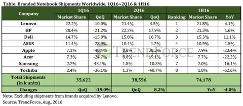Согласно опубликованной TrendForce статистике, за второй квартал 2016 года компания Apple продала в общей сложности 3.3 млн лэптопов, в сравнении с предыдущим периодом с показателями в 2.5 млн, это больше. Увеличение доходов агентство TrendForce напрямую связывает с выпуском нового Apple MacBook с 12-дюймовым экраном. Напомним, представленный в апреле ультрабук работает с процессором Skylake, графикой Intel HD 515, накопителем PCIe и демонстрирует увеличенную автономность.