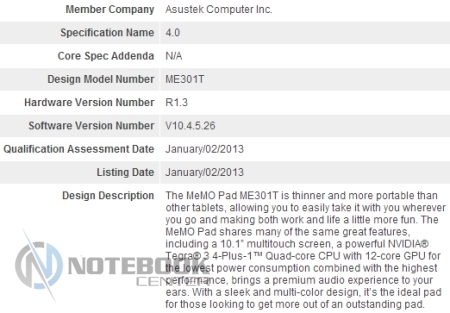 Появилась информация, что ASUS готовится выпустить новый 10-дюймовый планшет на платформе NVIDIA Tegra 3 с четырехъядерным процессором. В прошлом месяце 10-дюймовый ASUS Memo Pad прошел сертификацию в FCC, а на этой неделе на сайте Bluetooth SIG появилась более подробная информация о характеристиках планшета.