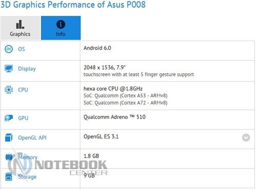 Устройство ASUS ZenPad S 2 8.0 работает на Android, имеет 7.9-дюймовый дисплей с разрешением 2048х1536 точек, а также беспроводные модули Wi-Fi, Bluetooth и LTE. В корпусе планшета можно увидеть процессор Qualcomm Snapdragon 650 с шестью ядрами (2хCortex-A72 и 4хCortex-A53), 2 ГБ RAM и 16 ГБ флеш-накопитель. Графические задачи выполняет видеокарта Adreno 510. По данным FCC емкость аккумуляторной батареи составляет 4680 мАч.