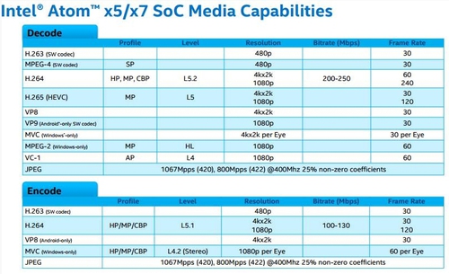 Что касается воспроизведения видео, то Intel обещает, что x5 и x7 будут в состоянии обрабатывать H.265 4K формата 30 кадров в секунду и H.265 1080p формата 120 кадров в секунду, но нет никакого упоминания о битрейте.