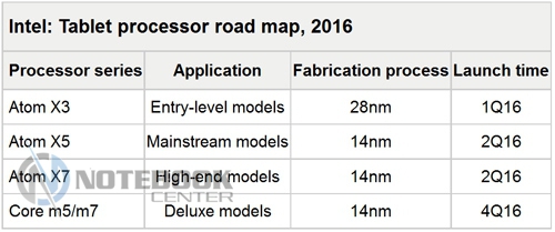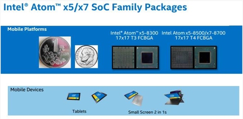 На данный момент компания предлагает три линии чипов, нацеленных на таблетки с низким энергопотреблением и ноутбуки 2-в-1: Intel Atom x5 и x7 Cherry Trail, Celeron и Pentium Braswell, Intel Core M Broadwell Y.