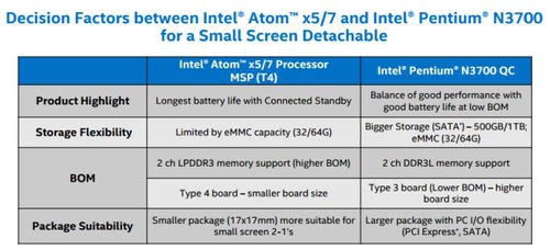Intel рассказала подробности о своих новых линейках на Developer Forum в Китае. Наиболее очевидными различиями чипов являются цена и производительность от наименее дешевого (и производительного) до наиболее: Atom x5, Atom x7, Celeron, Pentium и Core M. Но компания также указывает на то, что вы получите более длинный срок службы аккумулятора (при той же емкости) в случае выбора процессоров Atom. Кроме того, Intel рекомендует использовать процессоры Atom с eMMC-накопителями, в то время как системы, оснащенные процессорами Celeron и более мощными, могут использовать eMMC, mSATA или SATA-накопители для большего объема памяти.