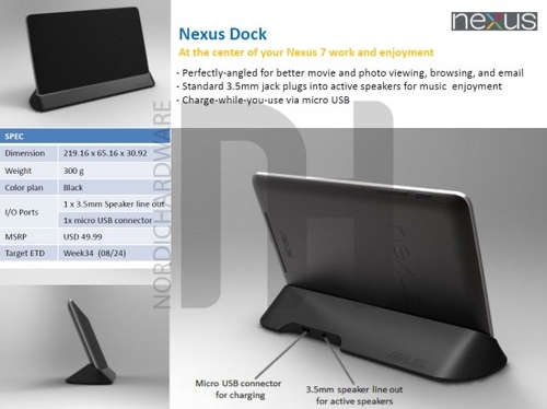 Среди новинок для Nexus 7 - док-станция черного цвета «Nexus Dock», которая оснащается портом microUSB для зарядки планшета, а также 3.5-миллиметровым разъемом для наушников. А вот такого ожидаемого разъема, как HDMI в планшете нет. Угол наклона подставки будет оптимальным для работы с текстовыми файлами, просмотра фильмов и, конечно же, веб-серфинга. Стоимость устройства будет составлять порядка $50, а его продажи начнутся 24 августа.