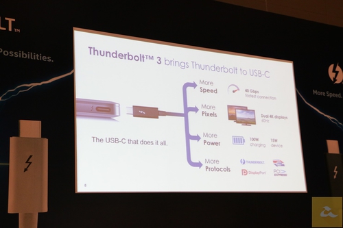 На Computex 2015 Intel объявила, что за основу Thunderbolt 3 будет взят стандарт USB Type C. Новый Thunderbolt 3 сможет обеспечить пропускную способность до 40 Гбит, что в два раза больше чем Thunderbolt 2, и при этом он будет в состоянии поддерживать протоколы USB, Thunderbolt, DisplayPort и PCI Express. Intel утверждает, что Thunderbolt 3 имеет поддержку одновременно двух дисплеев 4K 60 Гц или же одного 5K 60 Гц.