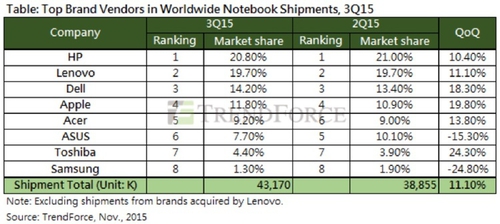 Известная аналитическая компания TrendForce привела данные, согласно которым отмечается увеличенный спрос на ноутбуки. Причем он больше, чем ожидалось. Так, статистика экспертного отдела сообщает, что показатель выпуска ноутбуков за третий квартал нынешнего года превышает рост на 11.1%. В цифрах это составляет 43.17 млн устройств. Кроме того, аналитики прогнозируют, что в последние месяцы уходящего года активность не снизится, тем более что на рынок попадут ноутбуки на Windows 10.