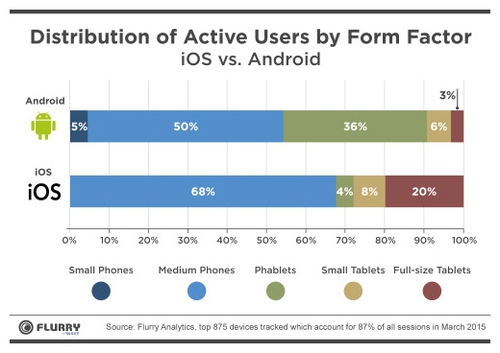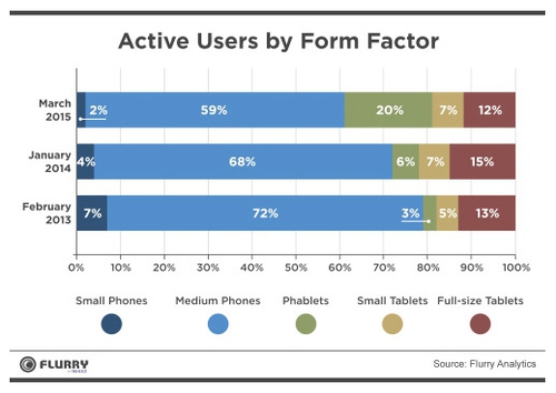 В январе 2014 доля всех пользователей фаблетов составляла всего 6% в то время как смартфоны с диагональю от 3.5 до 4.9 дюймов забрали себе 68%. И вот с января 2014 по март 2015 эта доля возросла до 20%, что довольно-таки немало для данного устройства. Зато доля смартфонов упала до 59%.