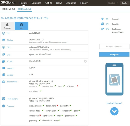 Довольно-таки часто не анонсированные устройства можно найти в результатах различных бенчмарков. Недавно неизвестный фаблет LG H740 со средними характеристиками (Snapdragon 615 SoC с графикой Adreno 405) был замечен на GFXBench. Помимо этого, устройство оснащено 5.7-дюймовый дисплеем с разрешением 1080p, 2 ГБ оперативной памяти, основной камерой на 12 Мп, фронтальной на 5 Мп и 8 ГБ встроенной памяти, а работает это все под управлением Android 5.1.1. Наряду с этим присутствуют и стандартные Wi-Fi, Bluetooth, GPS и NFC.