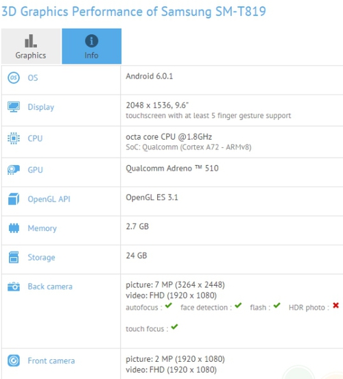 Конечно, подробные характеристики планшета неизвестны, однако, прежние утечки свидетельствуют о том, что гаджет будет оснащен 9.7-дюймовым дисплеем с разрешением 2048x1536 пикселей, 3 ГБ ОЗУ и 32 ГБ флеш-накопителем. Предполагается, что в качестве процессора выступит Qualcomm Snapdragon 652 с восемью вычислительными ядрами. Также в планшет установят 2 Мп фронтальную и 8 Мп основную камеры, LTE-модуль.