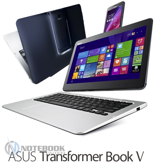 Не менее интересный и ASUS Transformer Book V, который может использоваться в пяти различных режимах, о чем тонко намекает его название. Book V может быть и ноутбуком, и планшетом, работая на ОС Windows или Android, если выбрать «главным» 5" Android-смартфон с LTE. «Ноутбучная» часть гаджета оснащается 12.5-дюймовым IPS-дисплеем с разрешением Full HD, накопителем емкостью до 1 ТБ (для ОС Windows 8.1) и 128 ГБ SSD (для Android KitKat). Переключение происходит очень плавно, без каких-либо заминок. При таком использовании трансформер способен проработать до 10 часов.