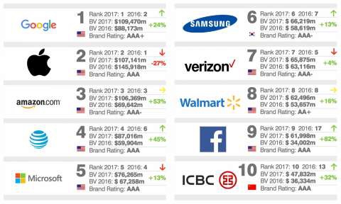 Консалтинговая компания Brand Finance последние пять лет регулярно публикует аналитические отчеты по компаниям с мировым именем. И, если раньше первое место регулярно занимала Apple, то в этот раз она уступила место другому гиганту – Google, сместившись на вторую позицию. Согласно данным, стоимость «яблочной» компании уменьшилась на 107 млрд долларов, а это примерно 27%. В это же время бренд Google подскочил в цене на $109 млрд, то есть на 24%. Соответственно, это и стало решающим фактором в определении победителя.