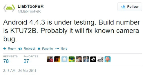 LlabTooFeR, пользователь из Twitter, сообщает, что «Android 4.4.3 находится на стадии тестирования», и «возможно, новая версия ОС исправит ошибку камеры». Напомним, что в устройствах на ОС Android 4.4.2 при работе камеры запускается один из процессов, приводящих к быстрой разрядке аккумулятора. LlabTooFeR также сообщил и номер версии программного обеспечения – KTU72B, однако когда будет доступно обновления для обычных пользователей, не уточнил.